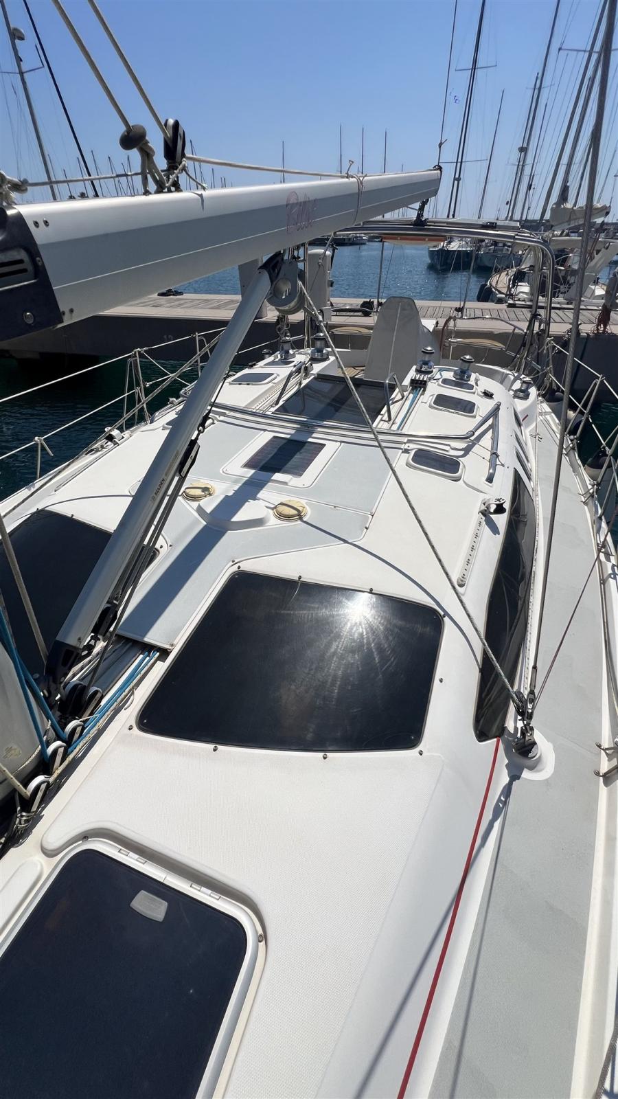 Ancre (Rocna), Eau sous pression, 3 Batteries, Douche de cockpit, Bossoirs pour annexe, Panneau solaire, Passerelle, Pompe de cale manuelle, Cockpit en teck, Prise de quai, Guindeau électrique, Gréement monotoron, Echelle de bain, Chaise support HB, table de cockpit, 5 Winch, Windex.