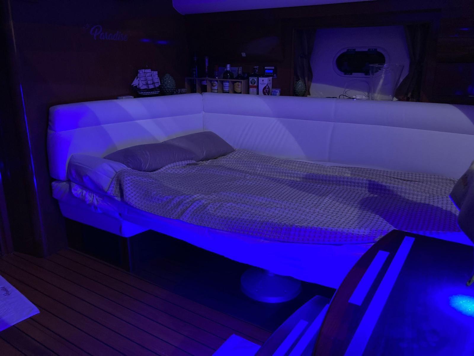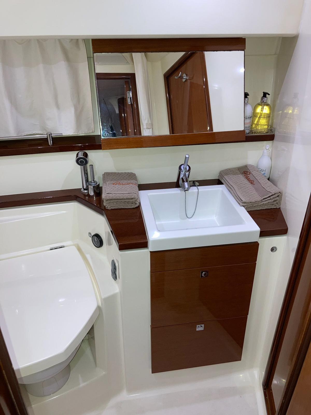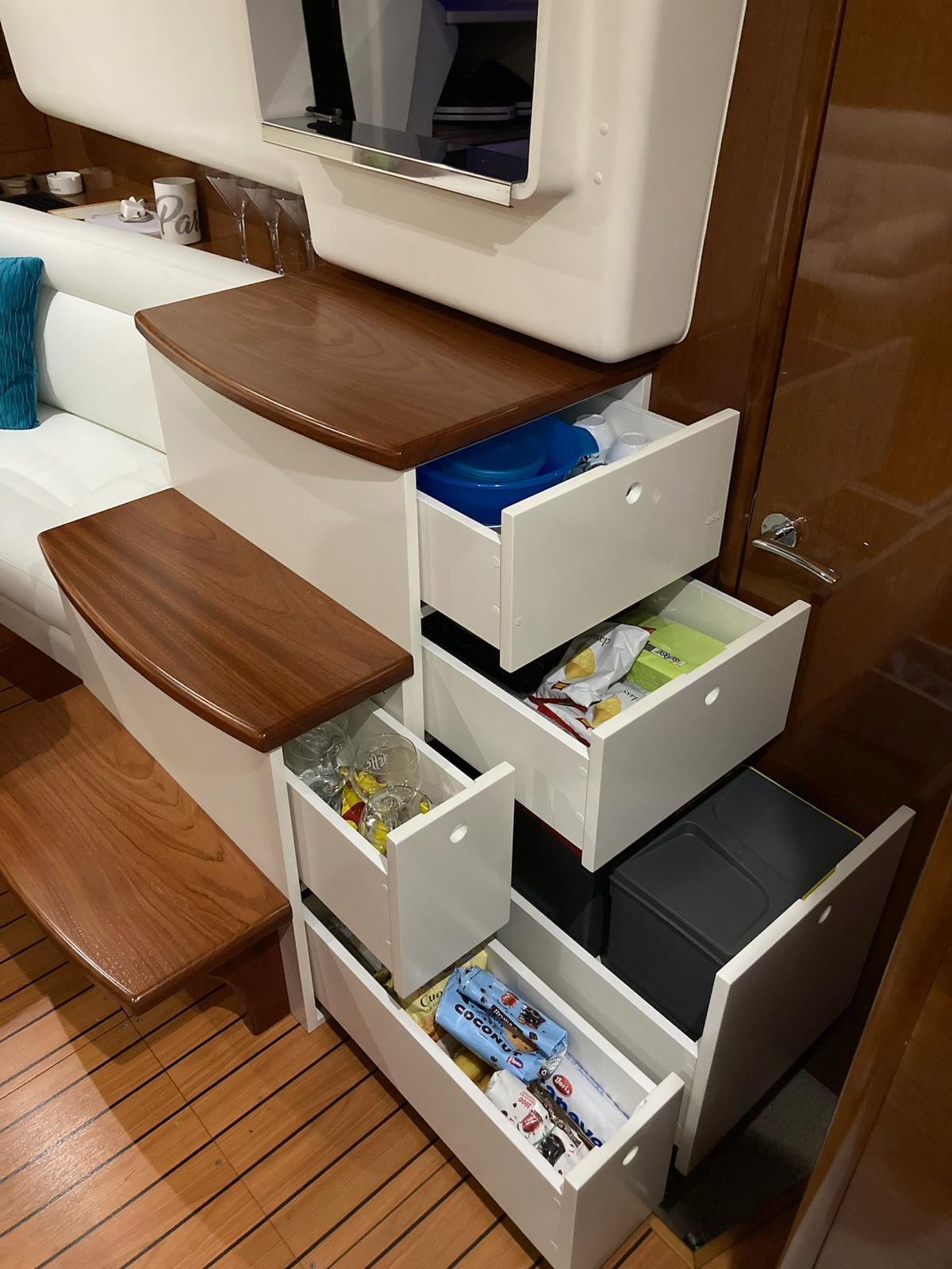 Alarme moteur, Ouverture du compartiment moteur électrique, Eau sous pression, Douche de cockpit, Flaps électriques, Hard top, Indicateurs de flaps, Lavabo dans le cockpit, Éclairage de courtoisie, Spots sous-marins, Passerelle, Plateforme arrière, Cockpit en teck, Prise de quai, Guindeau électrique, Echelle de bain, table de cockpit, Table pliante de salon, Corne.
