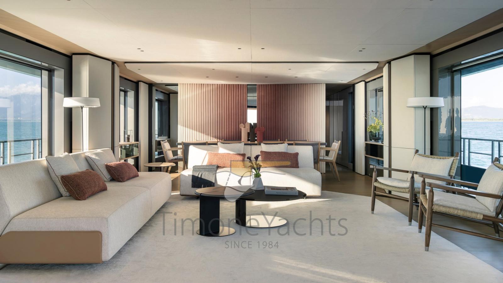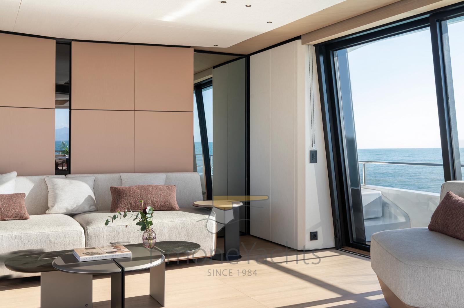 Les espaces polyvalents à bord permettent plusieurs solutions, offrant ainsi à chaque propriétaire la possibilité de choisir la disposition qui correspond le mieux à son mode de vie à bord. Le salon du pont principal peut offrir deux espaces de détente consécutifs, ou une solution plus traditionnelle avec un salon et une salle à manger pour suivre. Le skylounge peut également être aménagé comme salle à manger intérieure et extérieure, ainsi que salon cinéma ou véranda.
