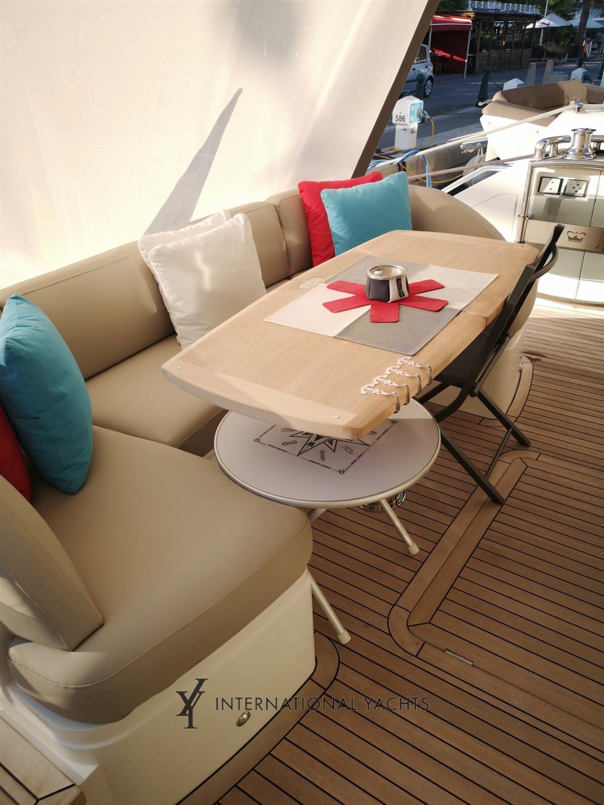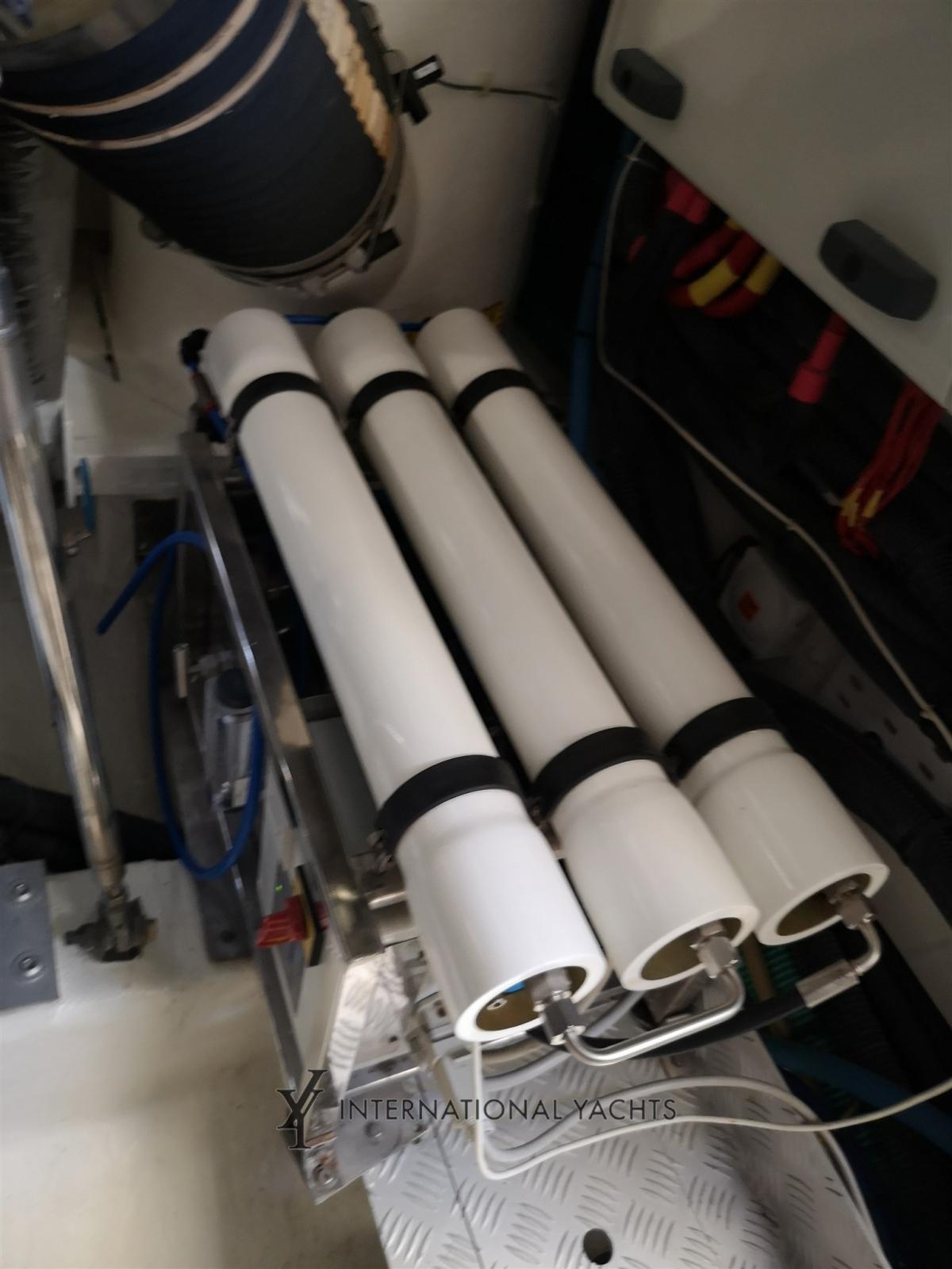 Alarme gaz, 2 Alarme moteur, Alarme de pompe de cale, Eau sous pression, Passavant en teck, Douche de cockpit, Double barre à roue, Phare de poursuite, Flaps hydrauliques, Extincteur(s) fixe(s), Indicateurs de flaps, Éclairage de courtoisie, Plateforme arrière, 4 Pompe de cale automatique, Porte latérale, Cockpit en teck, Onduleur, Rollbar, Guindeau électrique, Echelle de bain, table de cockpit, Annexe, Corne.
