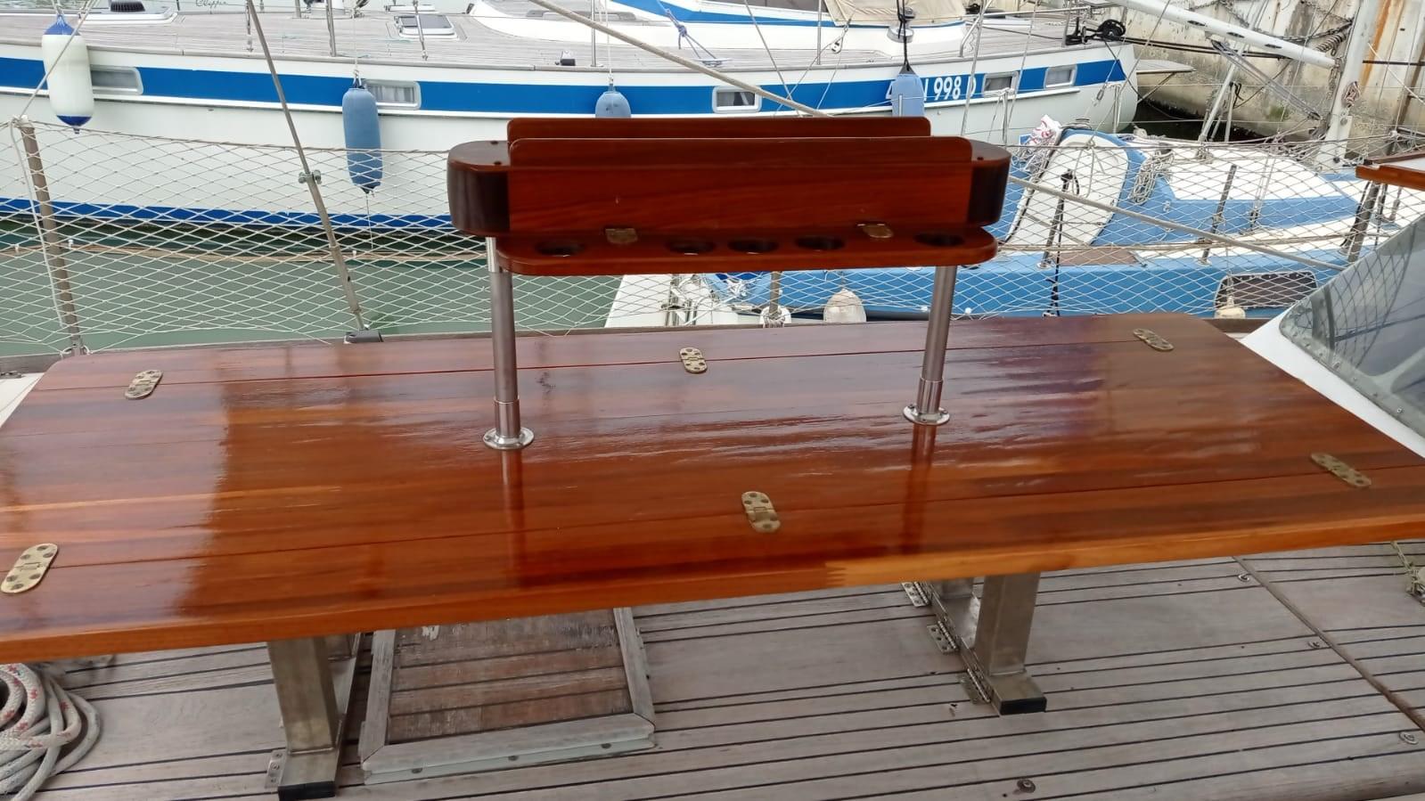 2019 : nouvelle grand-voile et flèche - traitement antiosmose effectué (5 couches de Defender - 2 couches d’antifouling) - montée 1 cm de teck neuf sur les ceintures