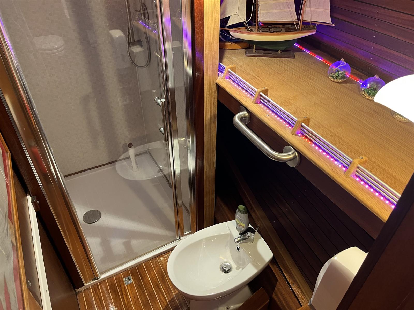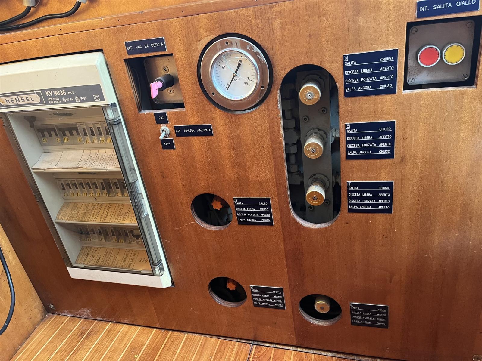 Eau sous pression, 5 Batteries, Douche de cockpit, Passerelle, Pompe de cale manuelle, Cockpit en teck, Prise de quai, Guindeau Hydraulique, Gréement monotoron, Echelle de coupée (in teak), table de cockpit, Pont en teck, 5 Winch.