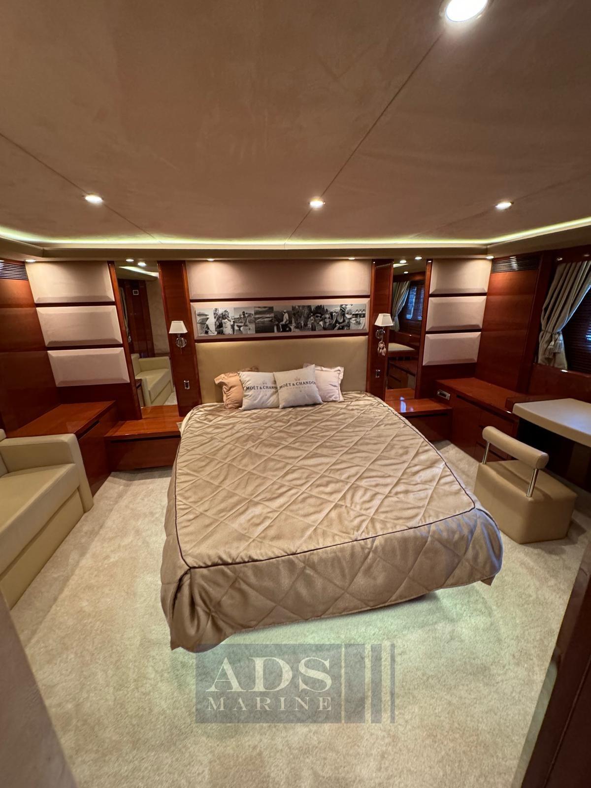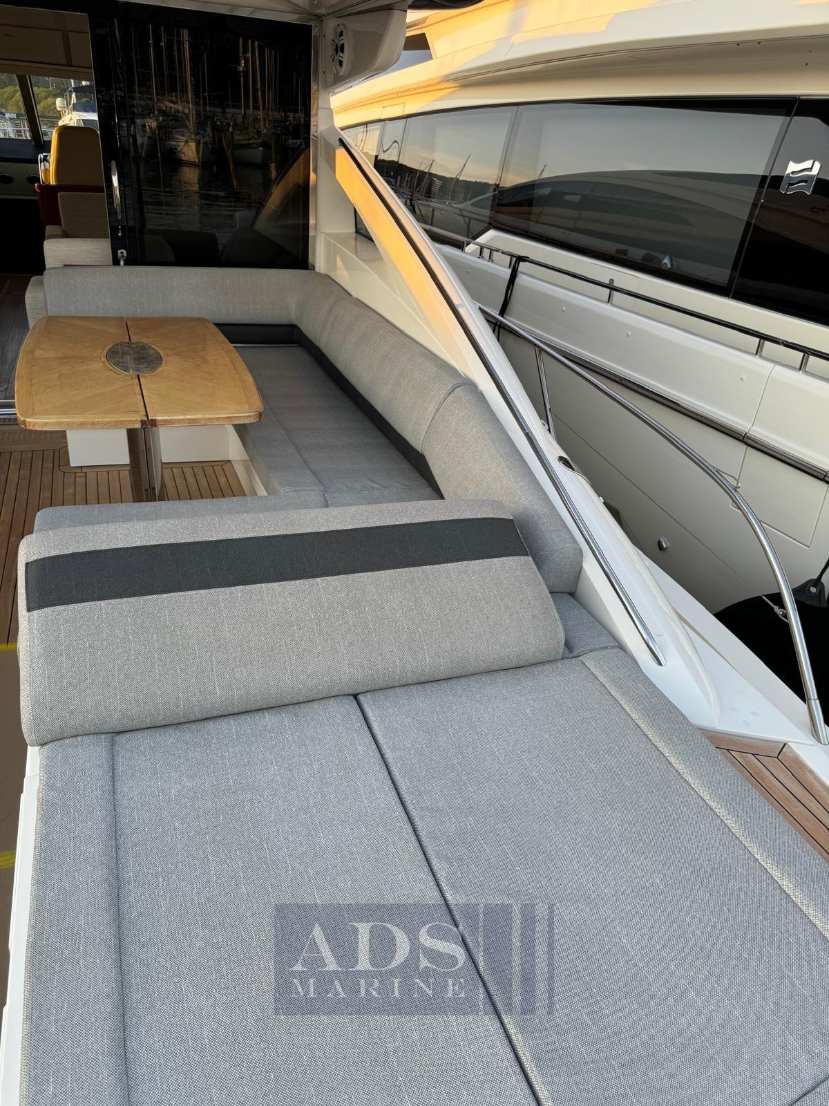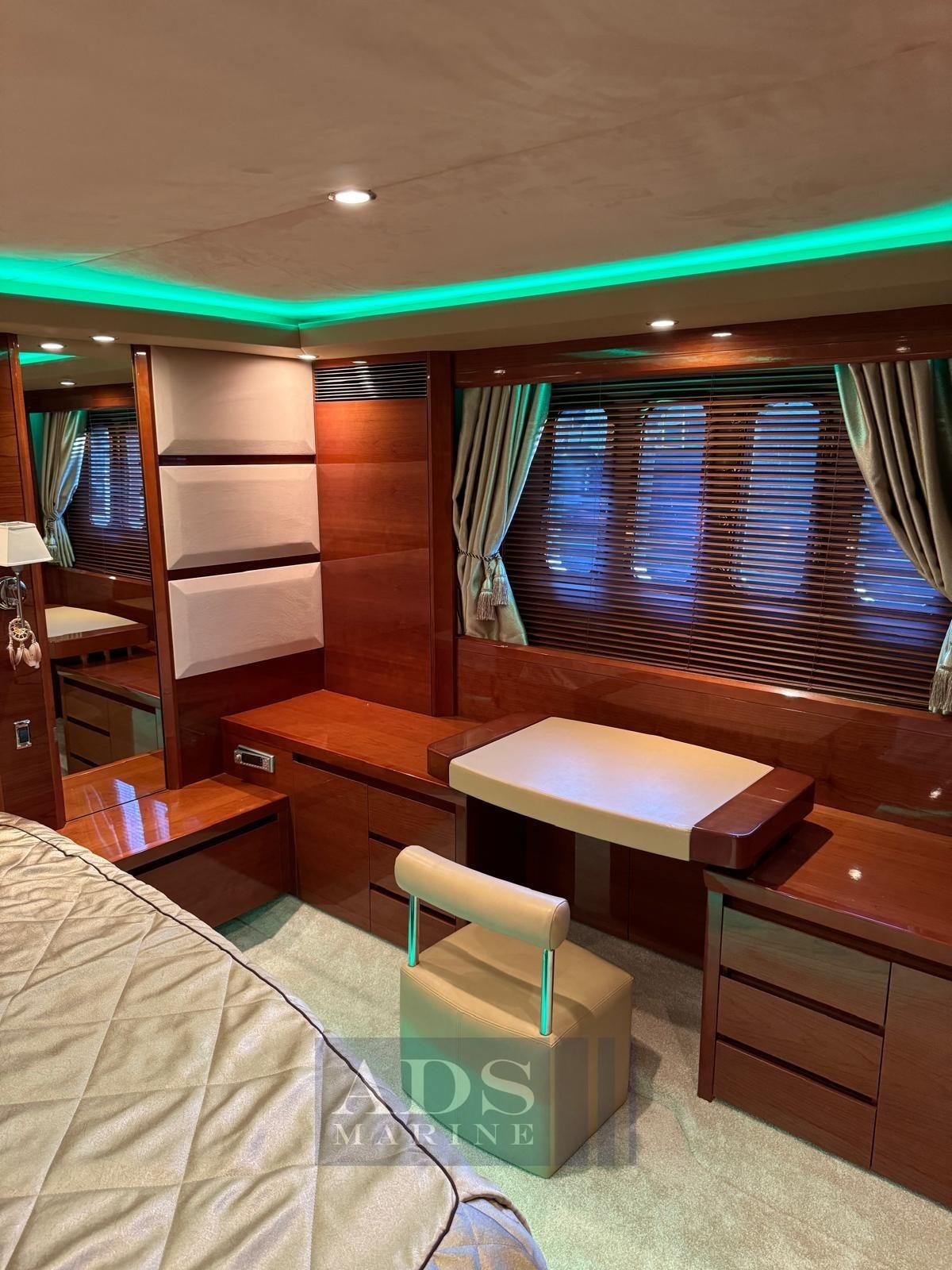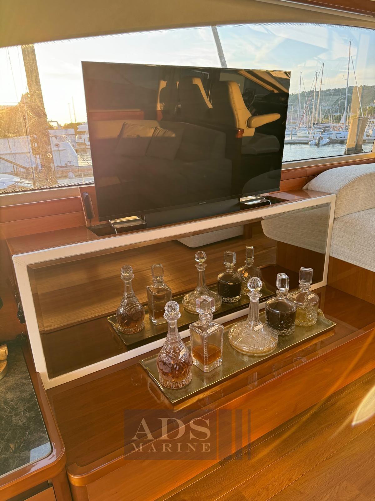 Intérieurs sur mesure : canapé latéral du salon réaménagé et remplacé par un meuble avec télévision rétractable, salon modifié deux chaises en un fauteuil inclinable, petite cabine jointe à un espace cuisine plus grand avec canapé et table, aménagement du bateau avec cabines de 2 chambres
