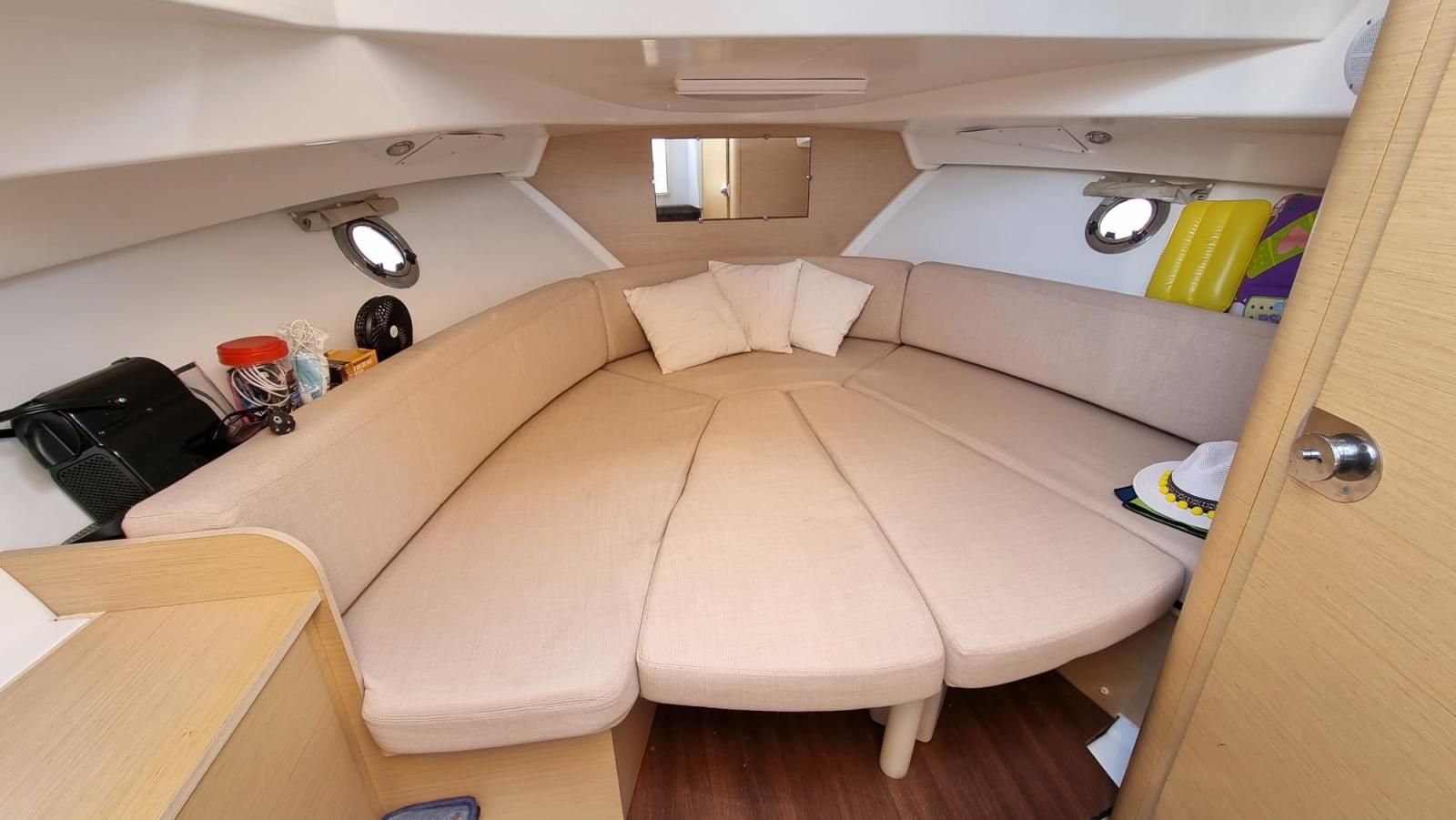 volets électriques - chaudière - lumières led - arceau de sécurité - auvent - coussins - table rétractable - 2 supports de tige - phare de profondeur - onduleur 220v - auvent de plus de 2 mètres. Bénéteau original