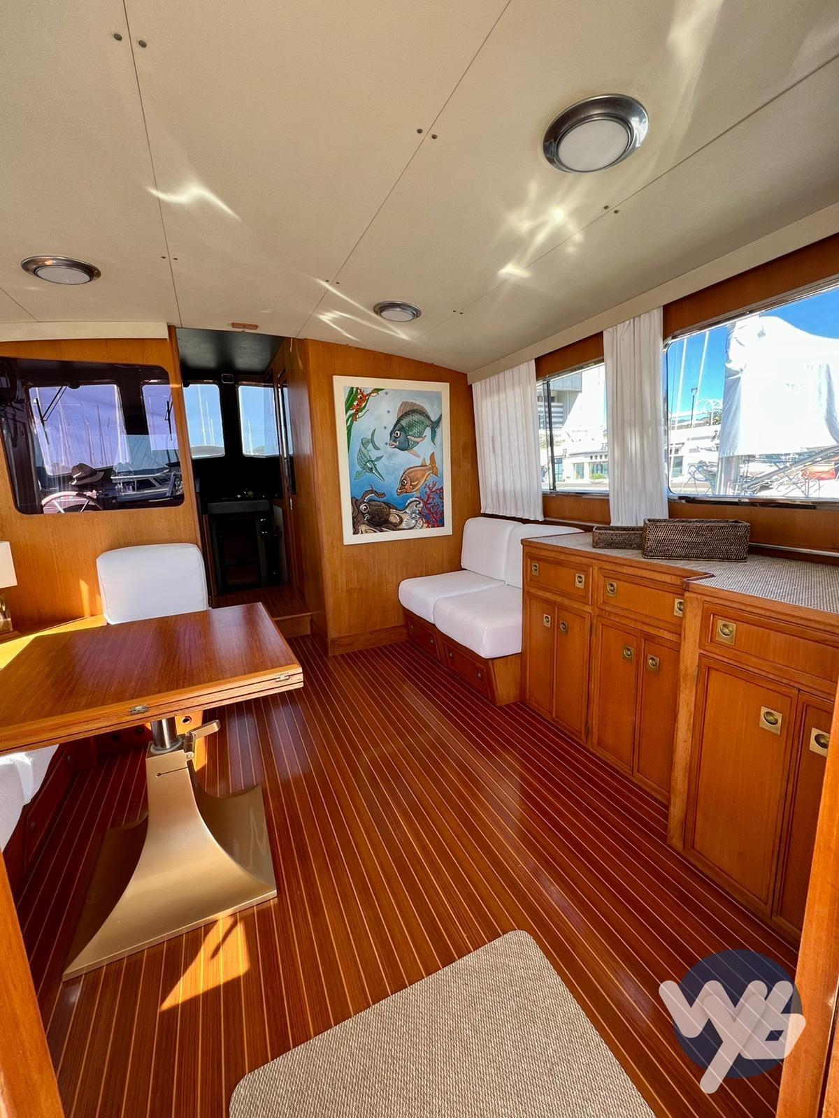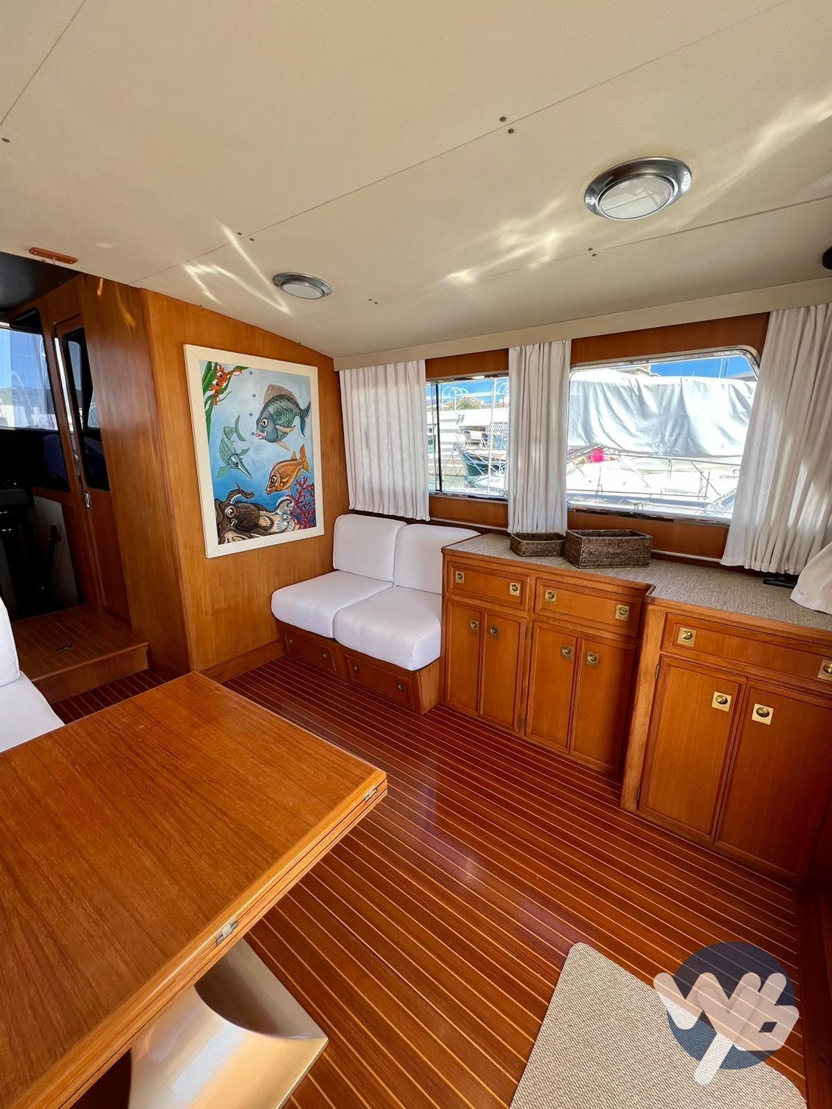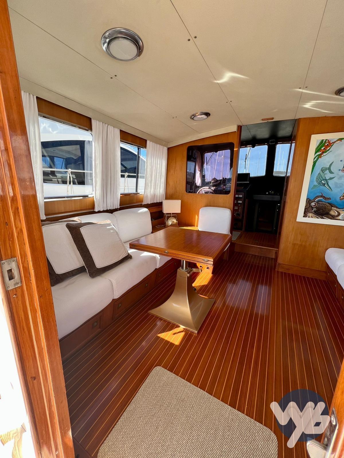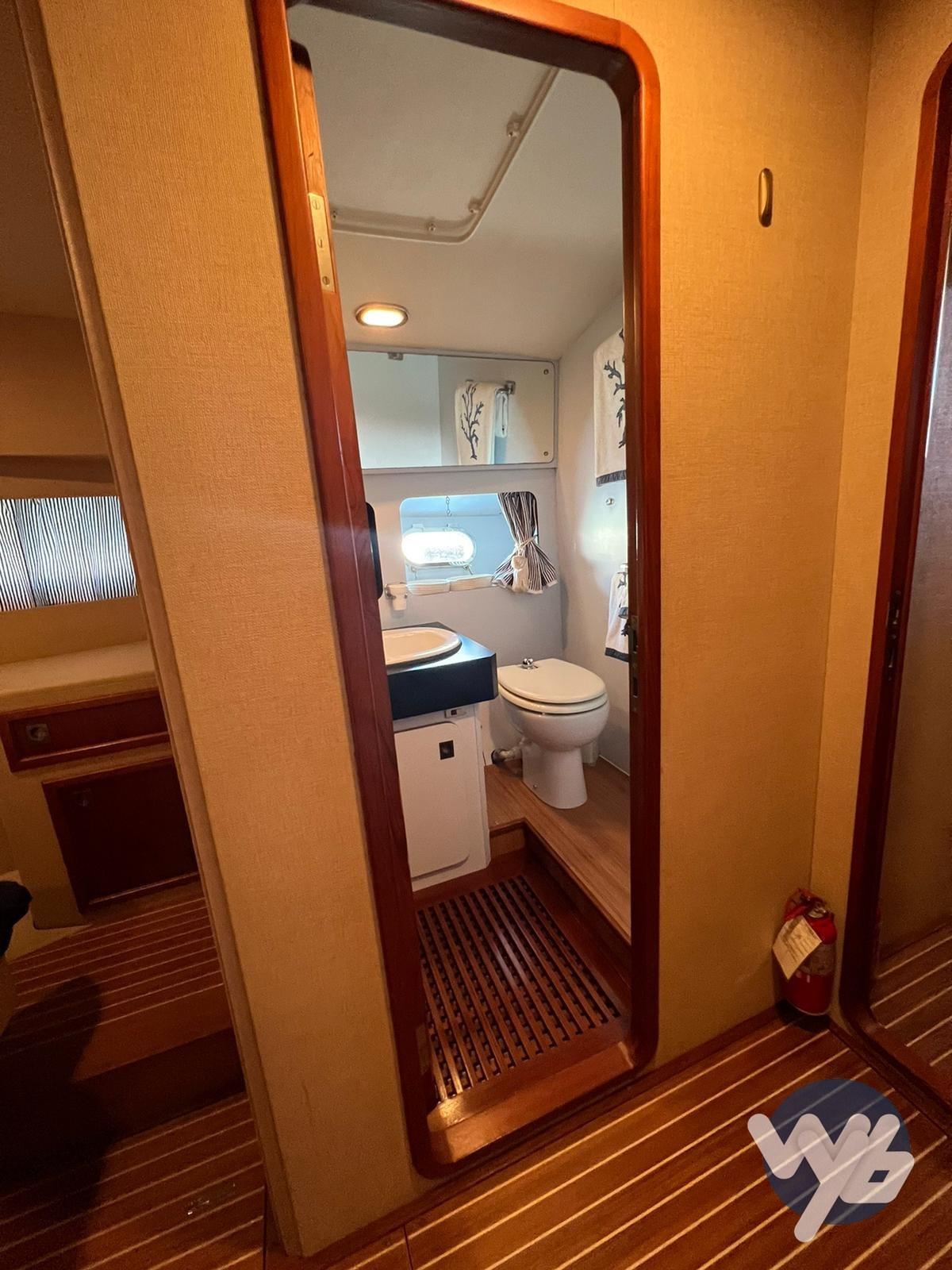 Grande cabine principale et deux cabines d’invités superposées avec services. Cuisine séparée et deux accès latéraux dans la proue.