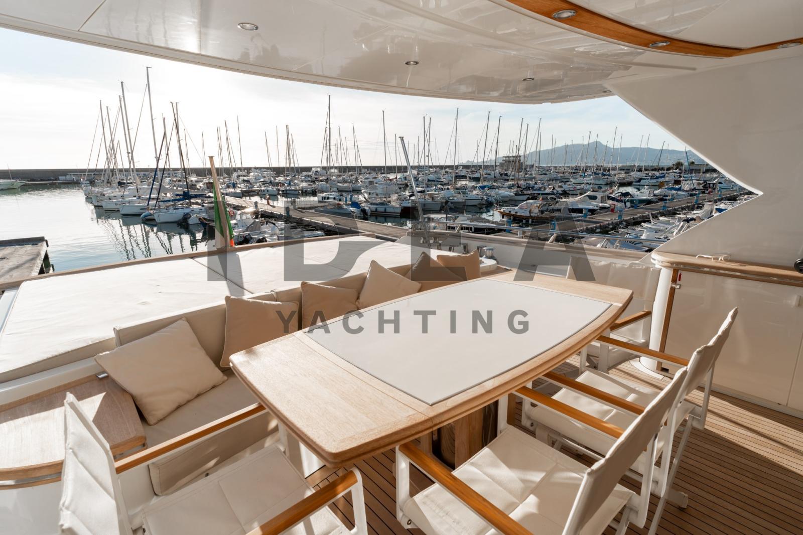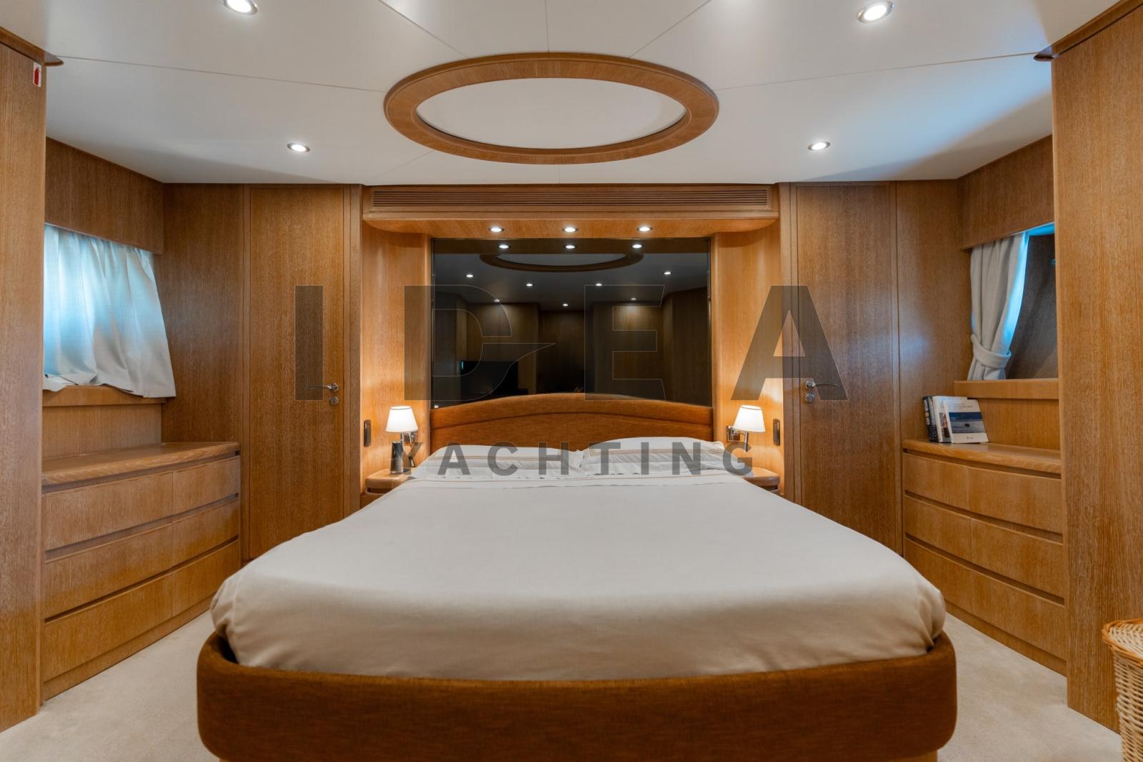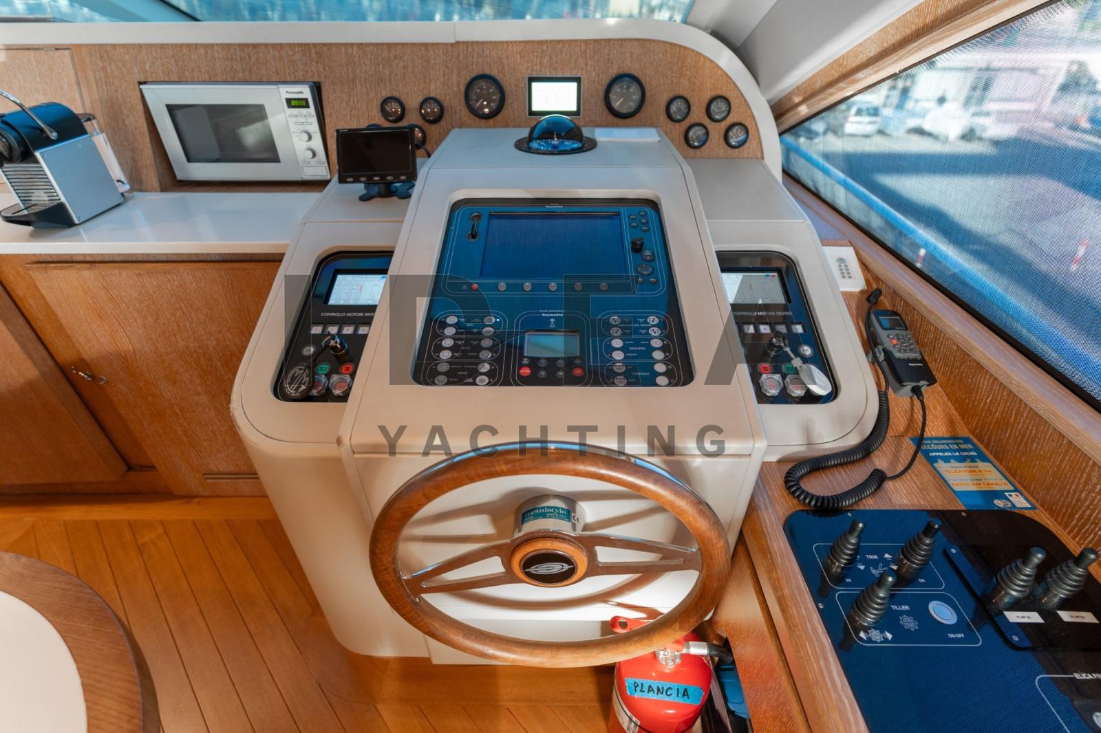 Alarme gaz, Alarme moteur, Alarme de pompe de cale, Ancre (Bruce 50Kg), 3 Eau sous pression (2×24V, 1x 220V), 2 Radeau de sauvetage, 2 Système de vidange, 6 Chargeur de batterie (2x services, 2x engines, 2x generators), Douche de cockpit, Double barre à roue, Propulseur de poupe (Hydraulic), Propulseur d'étrave (Hydraulic), Phare de poursuite, 2 Flaps hydrauliques, Garage à annexe, Bossoirs pour annexe, Extincteur(s) fixe(s), Compresseur de plongée, Indicateurs de flaps, Éclairage de courtoisie, 6 Spots sous-marins, Passerelle (Opac mare in steel telescopic hydraulic), Plateforme arrière, Porte latérale, 2 Porte latérale, Cockpit en teck, 2 Prise de quai, Répétiteur électronique, Rollbar, Guindeau électrique (Lofrans 2500watt), Echelle de bain (Electric), Selles pour Annexe, Système de filtration des eaux usées (Hamman), table de cockpit, Corne, 2 Winch électrique, 2 Winch électrique arrière, Winch électrique avant.