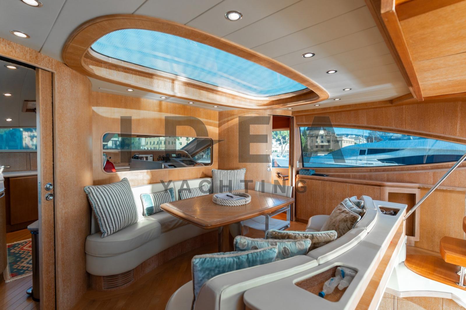 Le toit rigide ouvrant de ce yacht de sport inonde l’intérieur de lumière et d’une sensation de grande ouverture avec une atmosphère agréable dans le salon inférieur, accessible grâce à un escalier central et doté d’un coin canapé confortable et d’une salle de bain de jour. Au niveau supérieur, derrière le poste de pilotage et la cuisine, se trouve une table à manger confortable.
