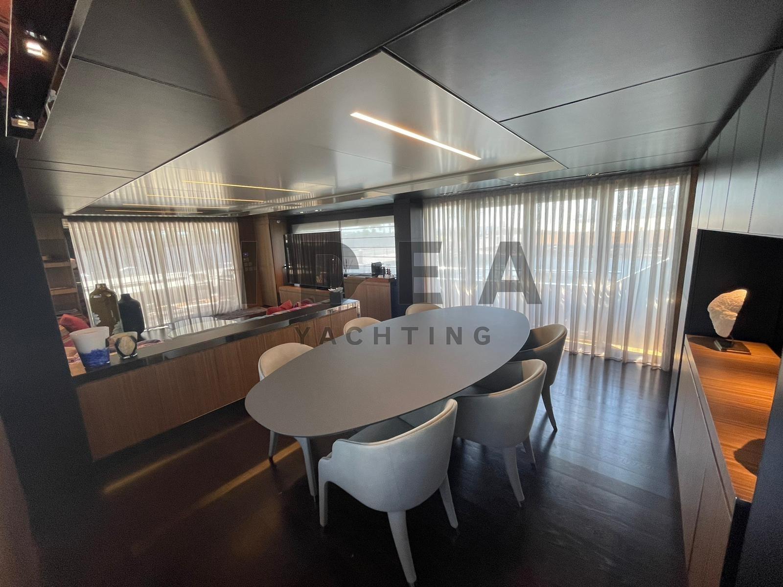 Alarme gaz, Alarme moteur, Alarme de pompe de cale, Eau sous pression, Passavant en teck, Chargeur de batterie (Automatic for generators), Douche de cockpit, Double barre à roue, Propulseur de poupe (Side Power 32hp), Propulseur d'étrave (Side Power 32hp), Phare de poursuite, Garage à annexe, Hard top, Éclairage de courtoisie, Passerelle (Hydraulic), Plateforme arrière, Pompe de cale automatique, Pompe de cale manuelle, Porte latérale, Cockpit en teck, Prise de quai, Connexion eau sous pression à quai, Répétiteur électronique (N°4 Simrad IS42), Guindeau électrique, Echelle de bain, 2 Stabilisateurs (Seakeeper), table de cockpit, Annexe (Williams Sportjet 435), Corne, 2 Winch électrique arrière, 2 Winch électrique avant.
