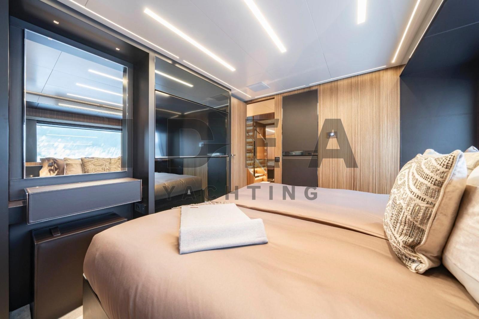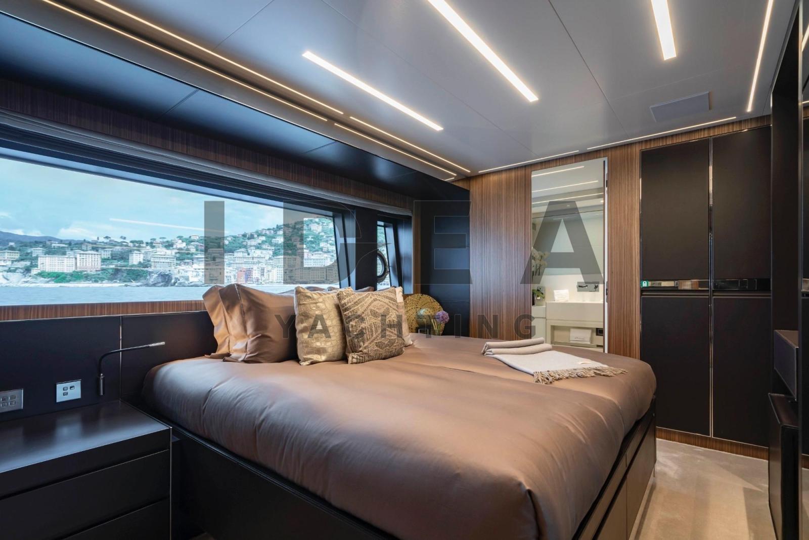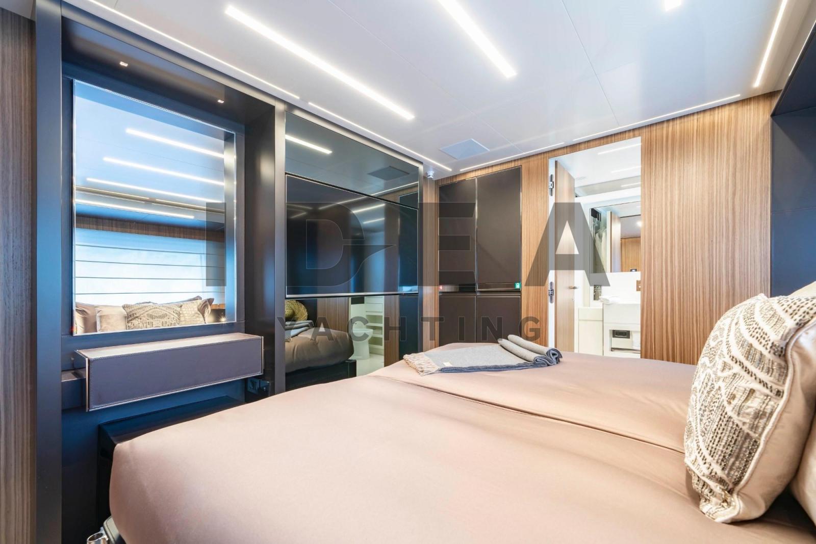 Cabine principale sur le pont principal avec salle de bain attenante, TV LED 49", dressing et coffre-fort.