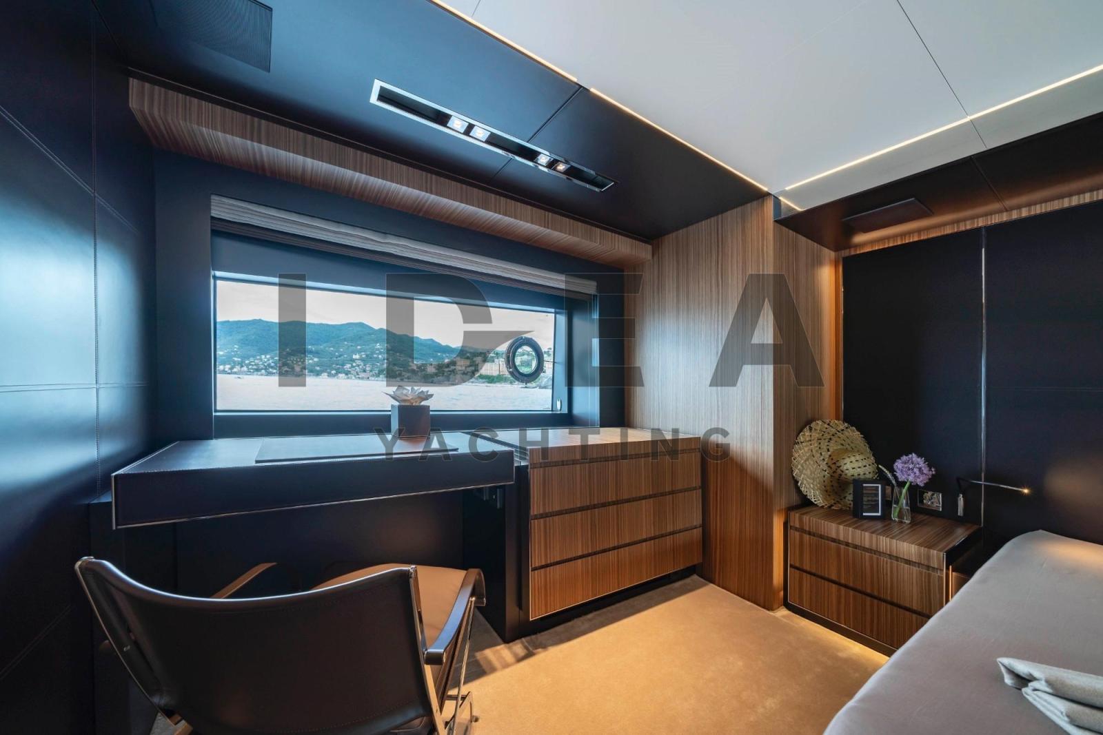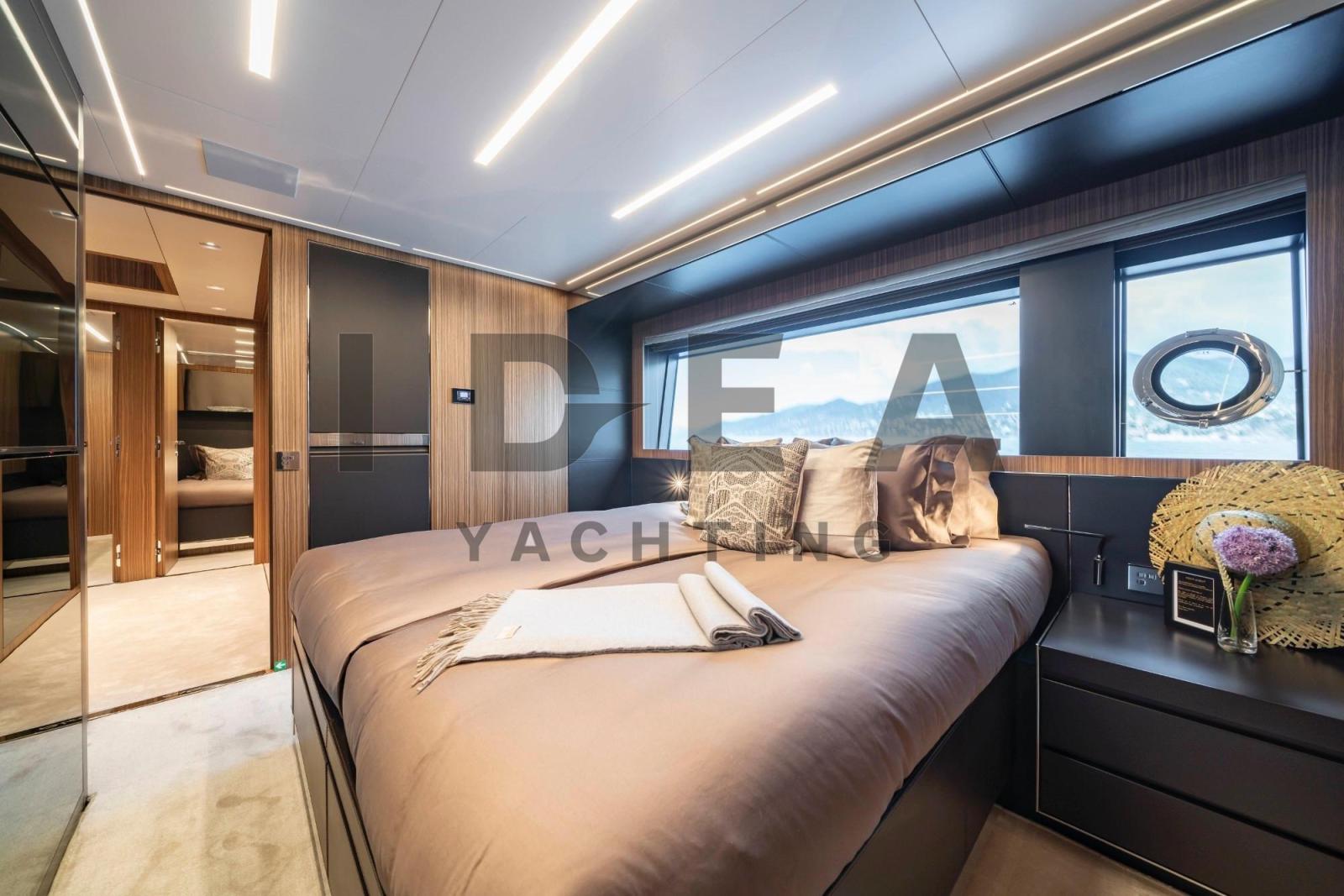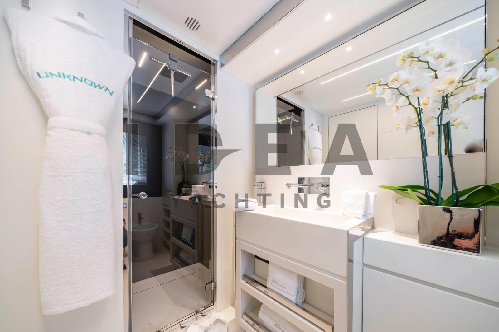 Cabine principale sur le pont principal avec salle de bain attenante, TV LED 49", dressing et coffre-fort.