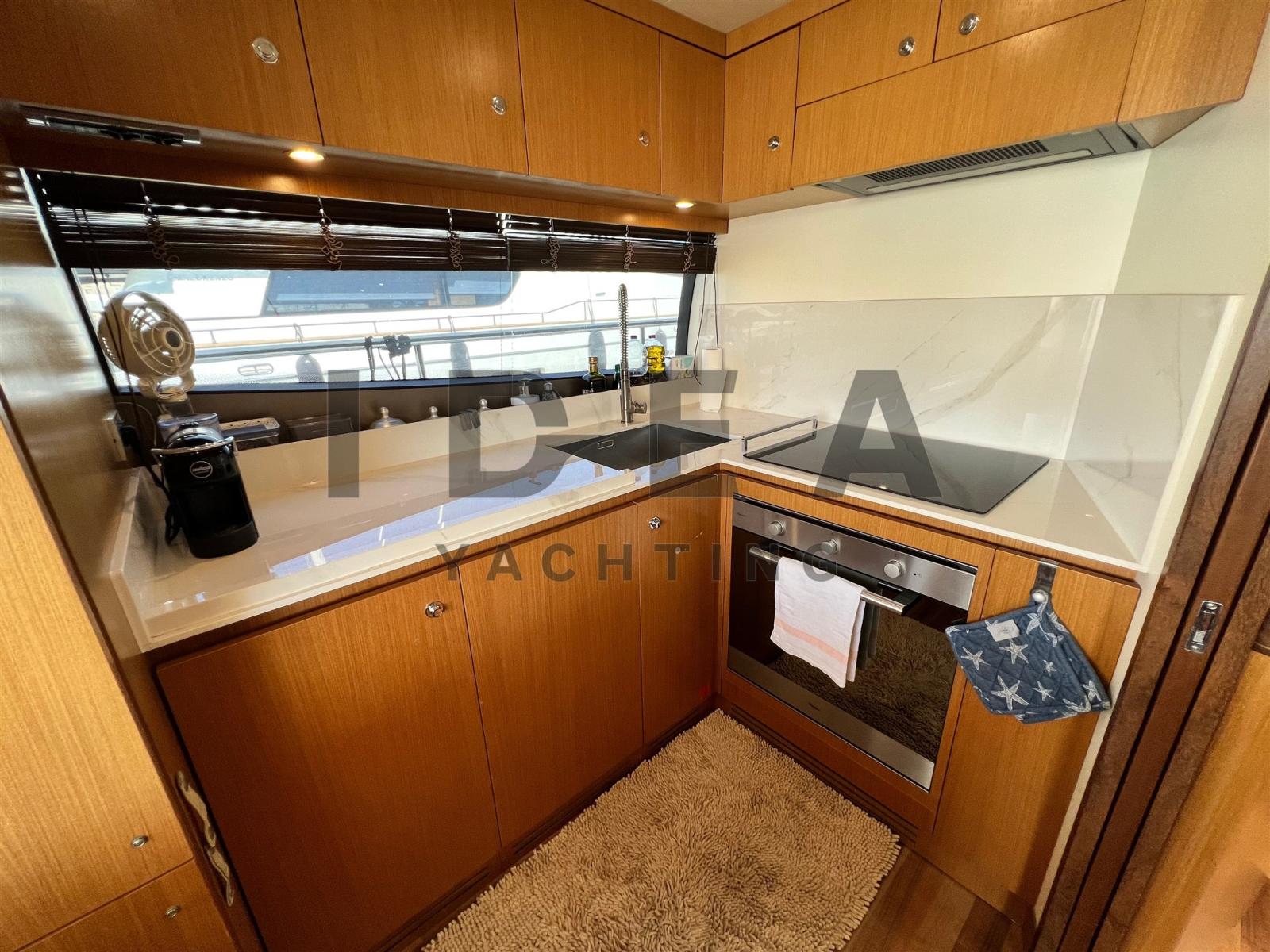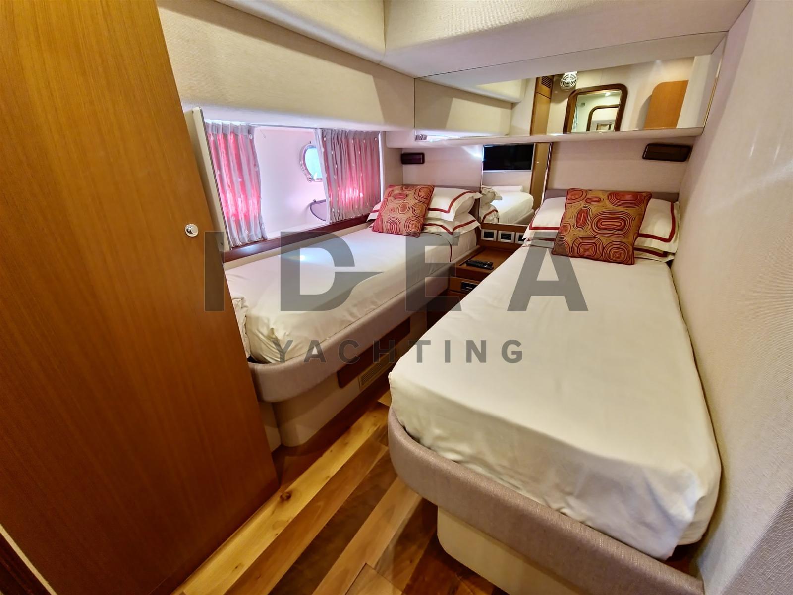 Excellente utilisation des espaces extérieurs, du grand et très confortable flybridge, à la salle à manger arrière et à la terrasse avant. La cuisine à l’entrée du salon est particulièrement belle, fonctionnelle et pratique. Ferretti 630 propose un hébergement confortable pour 6 personnes dans trois cabines bien meublées, chacune avec sa propre salle de bain privée : de la splendide cabine principale pleine largeur avec de grandes fenêtres à vue ouverte, la cabine VIP confortable à l’avant, les invités de la cabine avec deux lits plats.