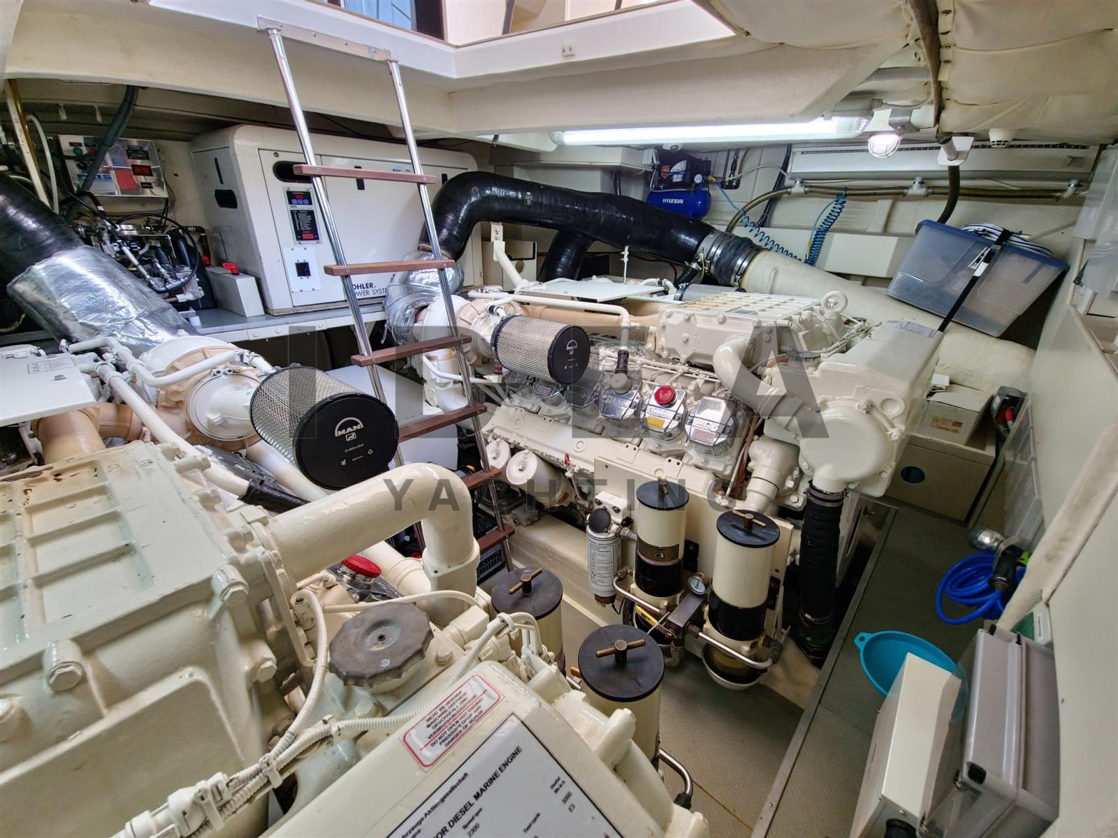 Alarme gaz, Alarme moteur, Alarme de pompe de cale, Ancre (Bruce 50Kg), Ligne d'arbre de rechange, Eau sous pression, Système de vidange, Douche de cockpit, Propulseur de poupe (Side Power), Propulseur d'étrave (Side Power), 2 Hélice de rechange, Phares fixes arrière, Phare de poursuite, Flaps hydrauliques, Bossoirs pour annexe, Extincteur(s) fixe(s), Compresseur de plongée, Indicateurs de flaps, Lavabo dans le cockpit, Éclairage de courtoisie, 4 Spots sous-marins (OceanLED), Passerelle, Plateforme arrière, Pompe de cale automatique, Pompe de cale manuelle, Porte latérale, Porte latérale, Cockpit en teck, Prise de quai, Connexion eau sous pression à quai, Onduleur, Rollbar, Guindeau électrique, Echelle de bain, Selles pour Annexe, Stabilisateurs (Mitsubishi Gyro), table de cockpit, Table pliante de salon, Corne, Winch, 2 Winch électrique arrière (Quick), Winch électrique avant (Lofrans).