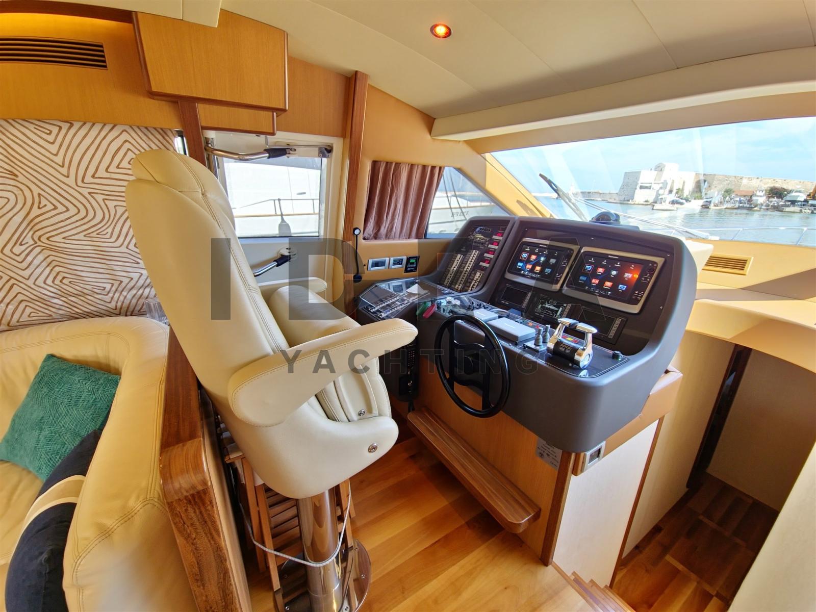 Ce Ferretti 630 est un flybridge de 20 mètres en option avec stabilisateur gyroscopique et troisième poste de contrôle à l’arrière. Il est en excellent état, ce qui, combiné avec les lignes pures du design, les finitions de qualité et un mobilier splendide font de ce bateau une création intemporelle qui vous permet de profiter pleinement du confort et de la détente de la mer. Les grandes fenêtres du salon permettent une visibilité à 360 degrés sur la mer.