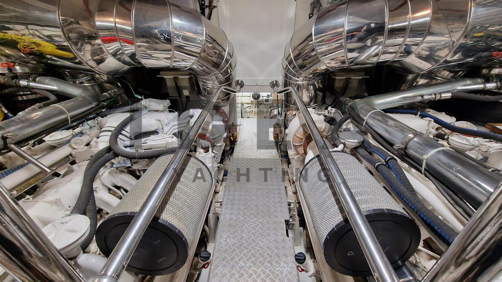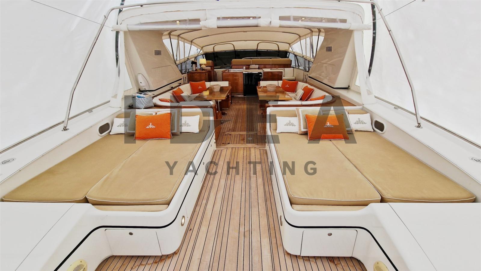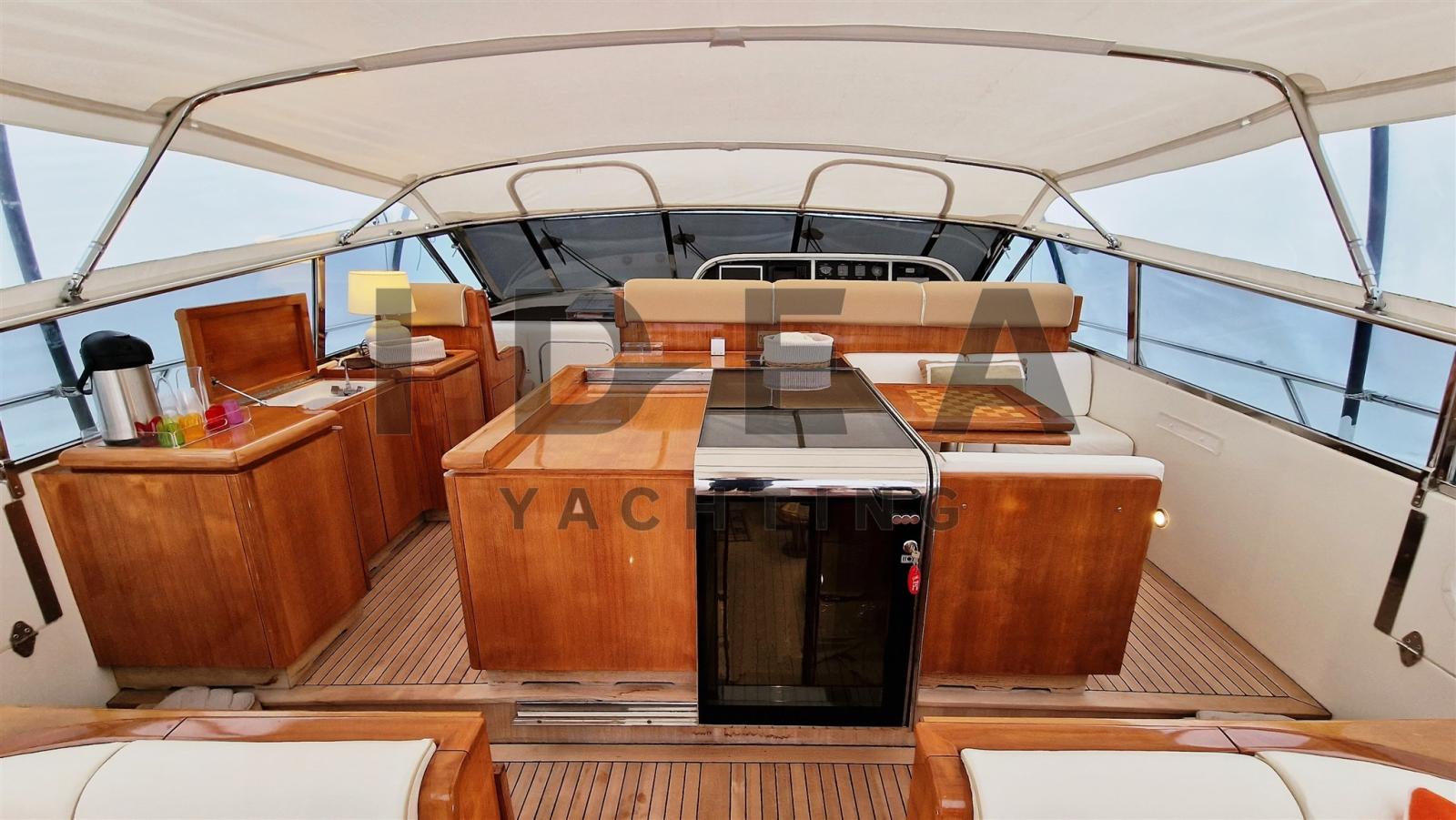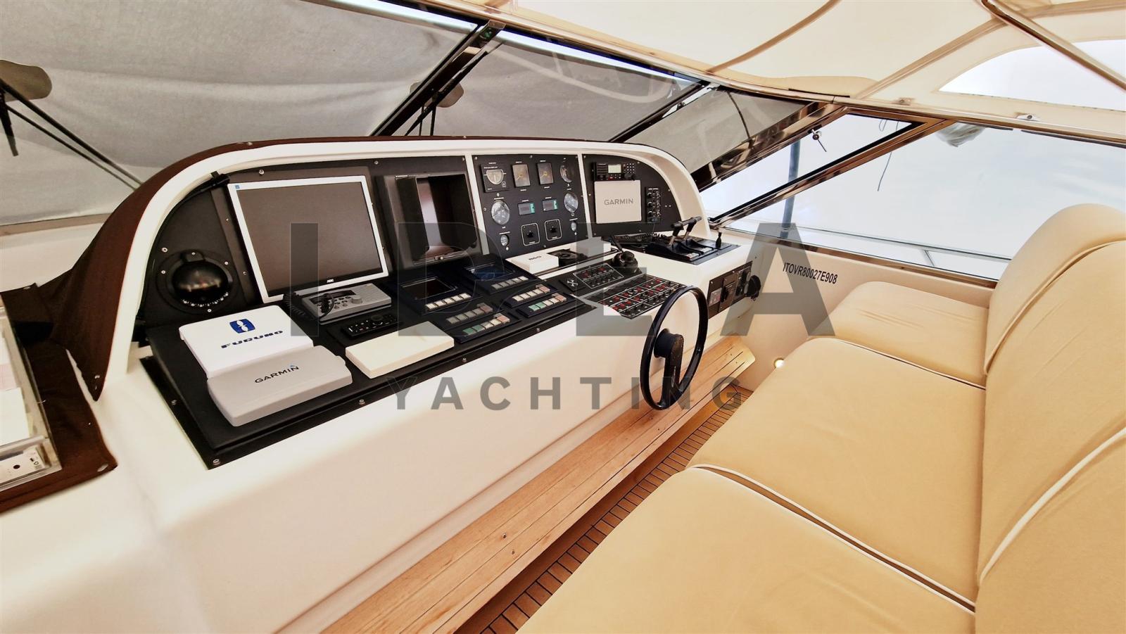 Alarme gaz, Alarme moteur, Alarme de pompe de cale, Auto Dynamic Trim Interceptor, Eau sous pression, Douche de cockpit, Phare de poursuite, Garage à annexe, Bossoirs pour annexe, Extincteur(s) fixe(s), Indicateurs de flaps, Lavabo dans le cockpit, Éclairage de courtoisie, Passerelle (Hydraulic), Plateforme arrière, Pompe de cale automatique, Pompe de cale manuelle, Porte latérale, Cockpit en teck, Prise de quai, Connexion eau sous pression à quai, Onduleur, Rollbar, Guindeau électrique, Echelle de bain, table de cockpit, Corne, 2 Winch électrique arrière, Winch électrique avant.