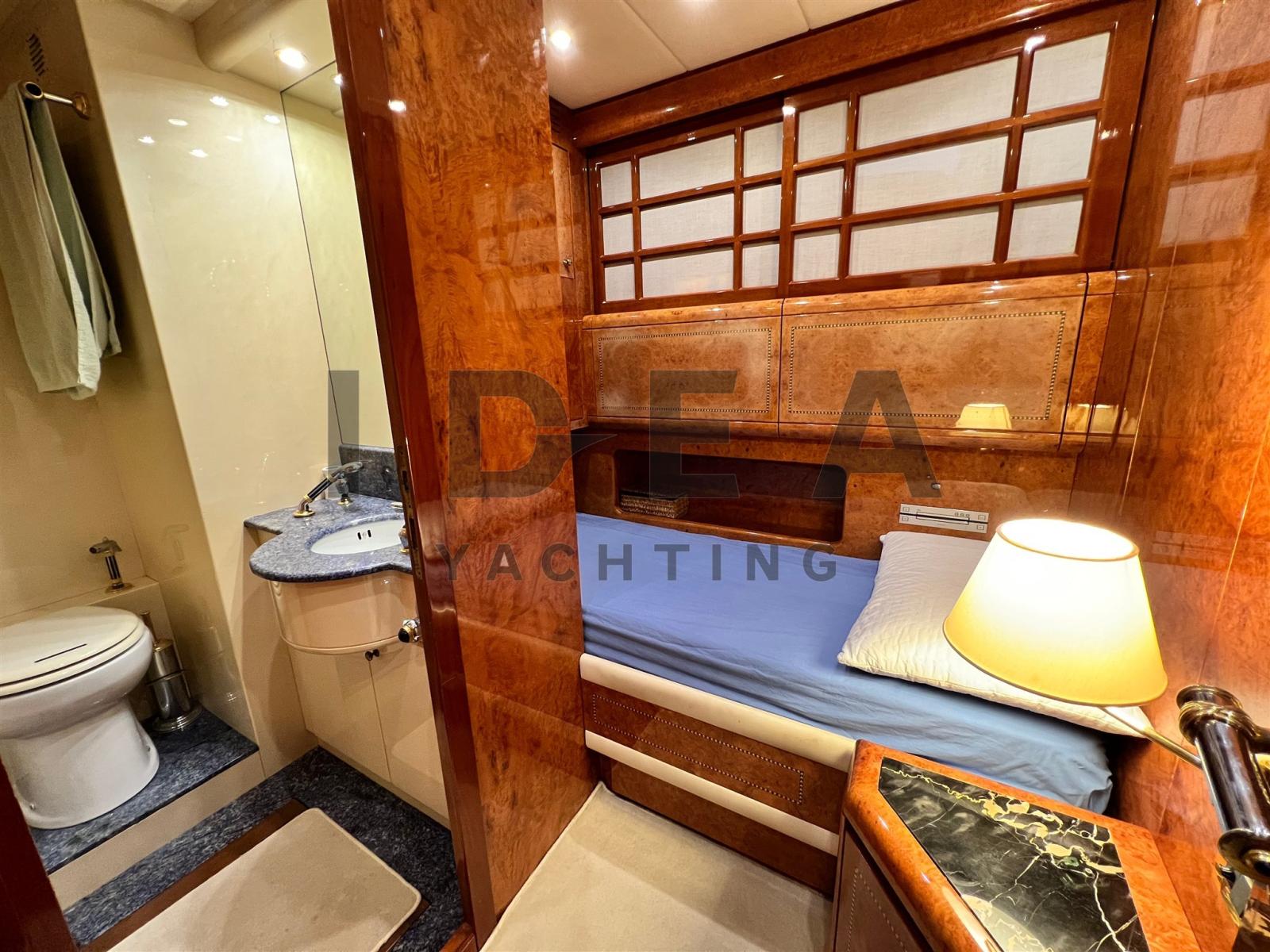 Cet élégant yacht à moteur s’étend sur une hauteur impressionnante de 23,38 mètres, offrant un espace généreux pour accueillir confortablement jusqu’à 7 invités dans quatre cabines magnifiquement aménagées. Il s’agit notamment d’une cabine principale avec salle de bains privative à l’avant, de deux cabines d’invités avec salle de bains privative au milieu du navire, l’une avec un lit double et l’autre avec des lits jumeaux, et d’une cabine simple polyvalente pouvant accueillir des invités ou un membre d’équipage.