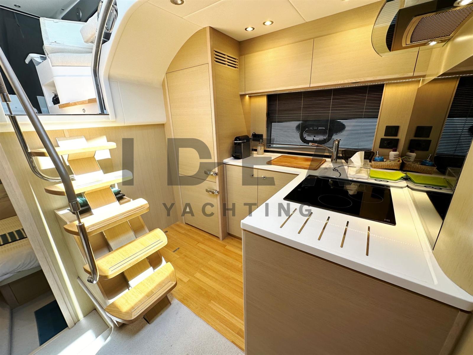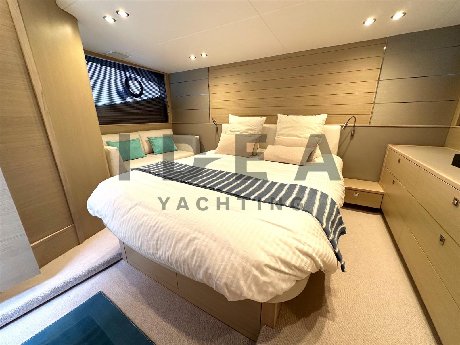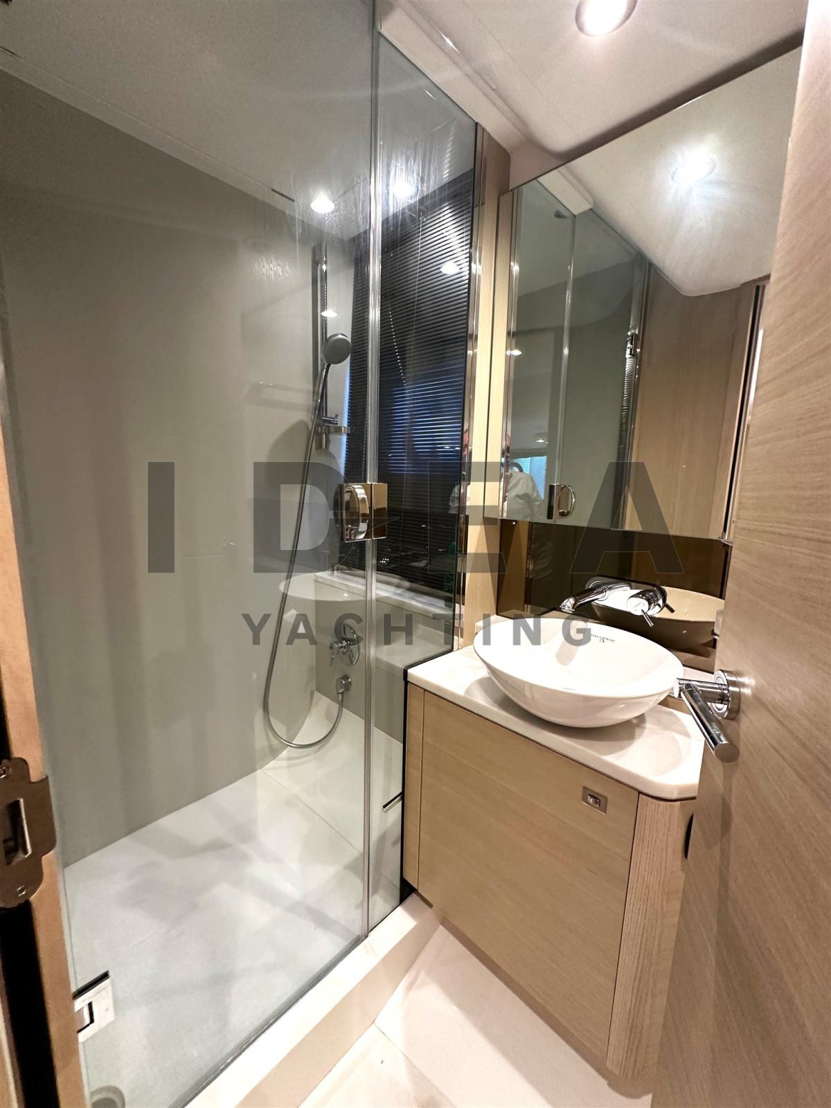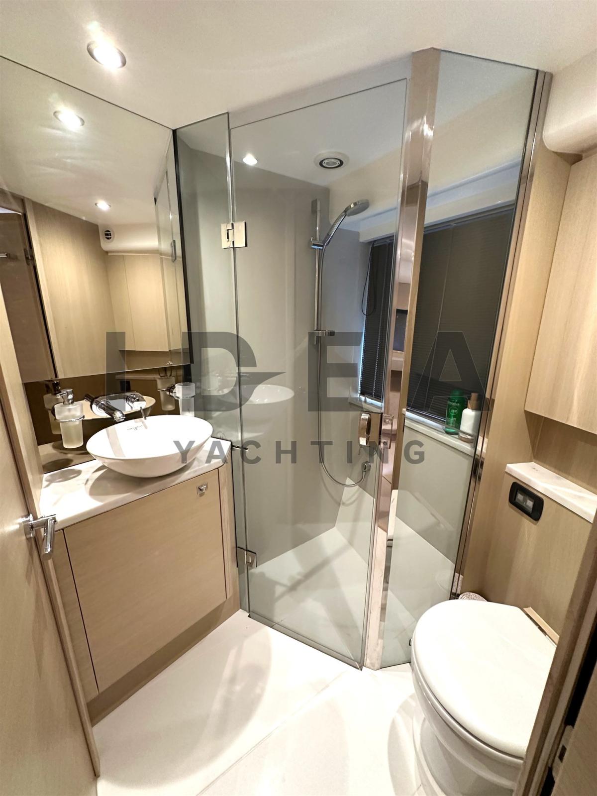 Eau sous pression, Passavant en teck, Garage à annexe (Electro-hydraulically opening garage with storage), Lavabo dans le cockpit, Spots sous-marins, Passerelle (Electro-hydraulic telescopic), Plateforme arrière (Electro-hydraulically), Cockpit en teck, Guindeau électrique, Stabilisateurs (Seakeeper 6), table de cockpit, Table pliante de salon.