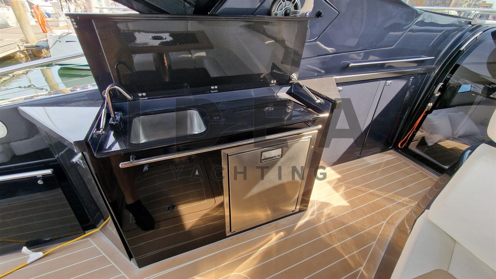 Alarme moteur, Alarme de pompe de cale, Eau sous pression, Passavant en teck (synthetic), Douche de cockpit, Propulseur d'étrave (Side Power), Flaps électriques (Bennett), Extincteur(s) fixe(s), Indicateurs de flaps, Lavabo dans le cockpit, Éclairage de courtoisie, Spots sous-marins, Panneau solaire, Passerelle (Manual in carbon), Plateforme arrière (Hydraulic), Pompe de cale automatique, Pompe de cale manuelle, Cockpit en teck (synthetic), Prise de quai, Onduleur, Guindeau électrique, Echelle de bain, table de cockpit, Corne.
