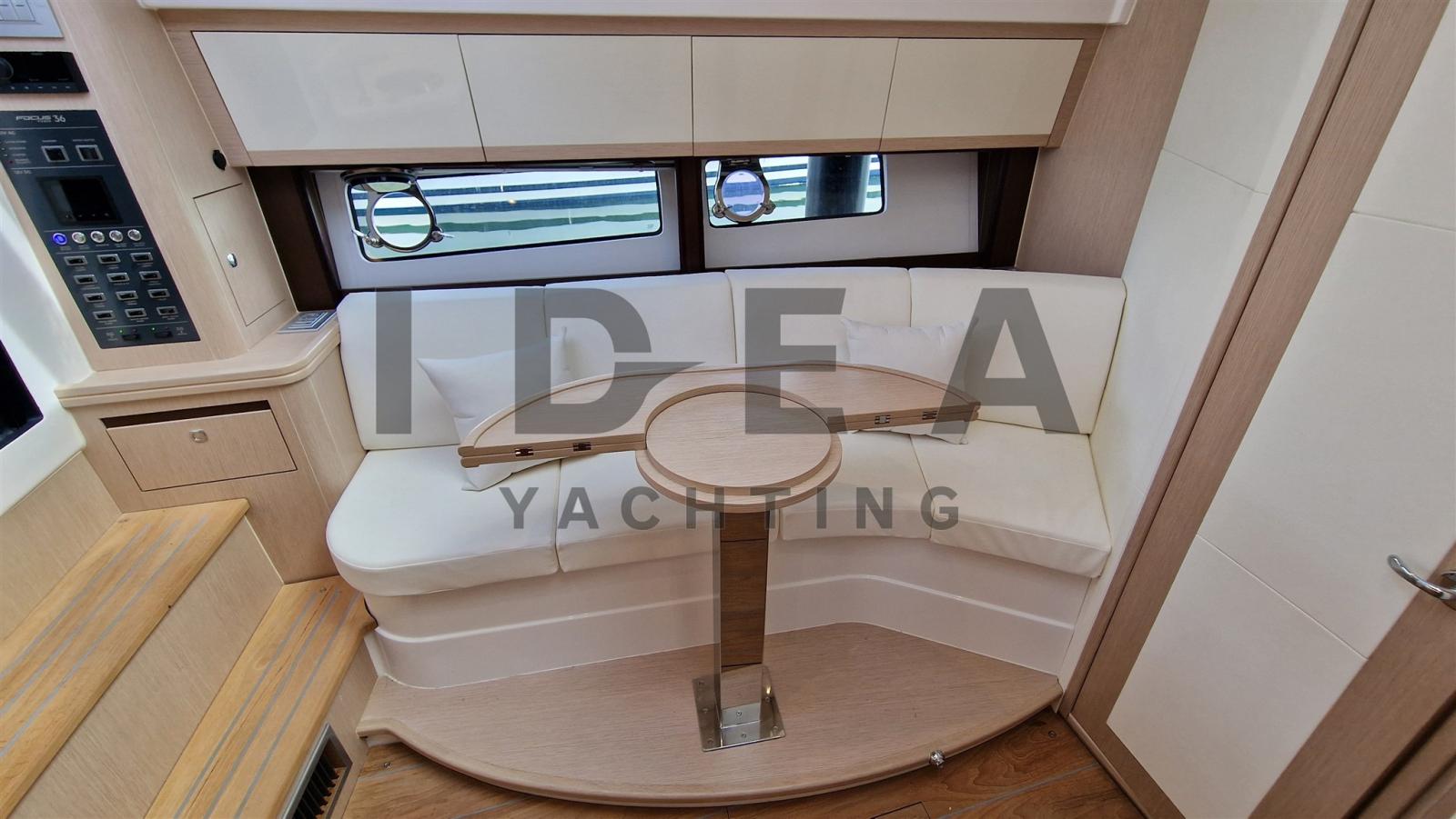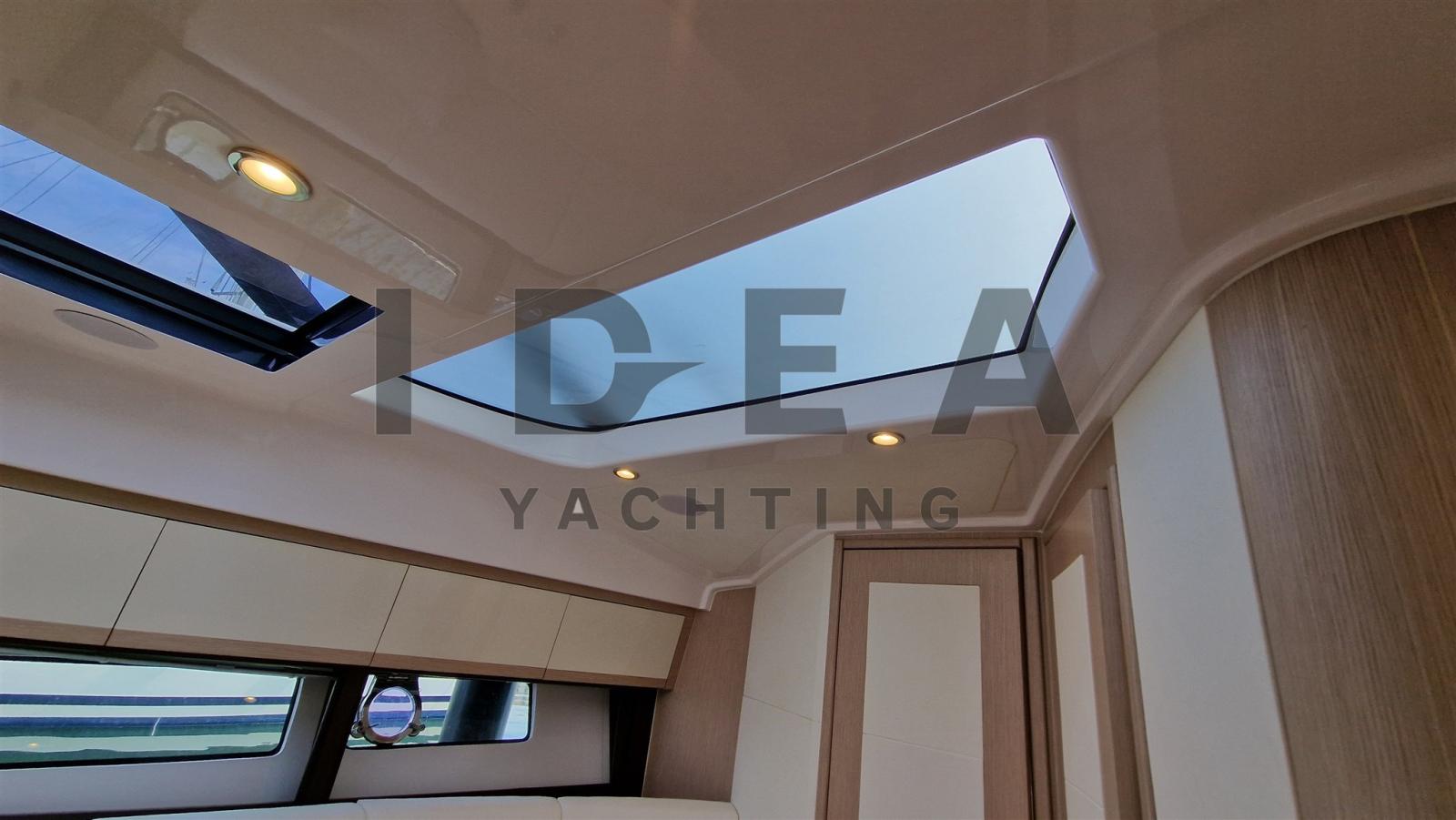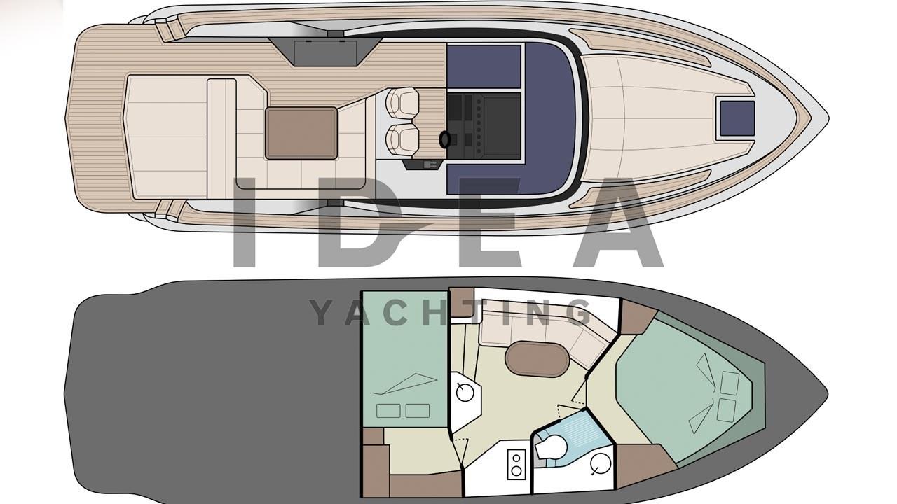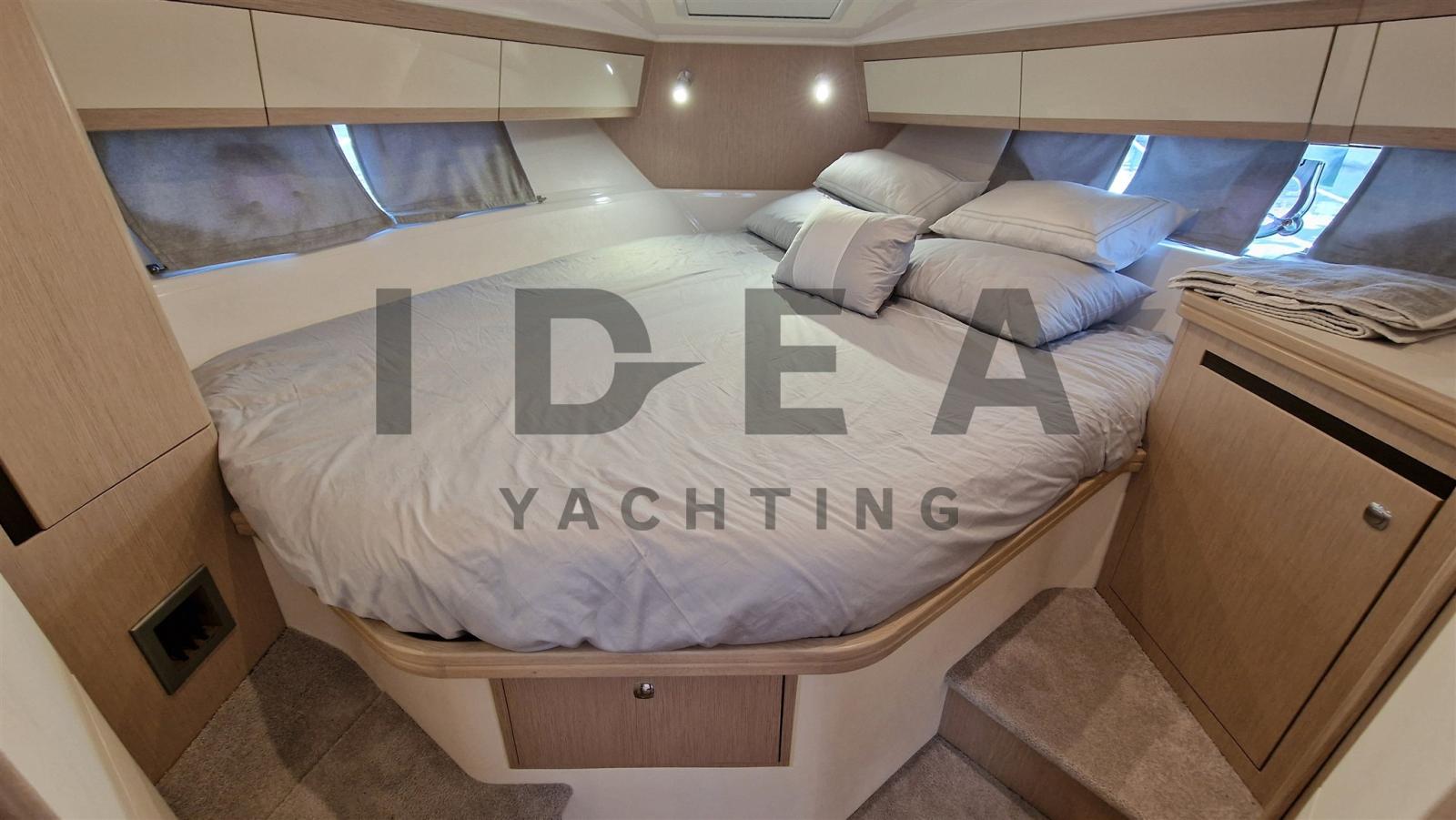 Le Focus Power 36 GTX est un yacht à moteur polyvalent et sophistiqué conçu à la fois pour la performance et le confort. La disposition du pont inférieur est particulièrement remarquable, car elle optimise l’espace tout en offrant une atmosphère chaleureuse pour la détente et les nuitées. La configuration comprend deux cabines doubles bien aménagées et spacieuses qui peuvent accueillir confortablement les invités. La lumière naturelle est facilitée par les hublots, créant une atmosphère chaleureuse et accueillante. La salle de bain unique dessert les deux cabines et est conçue pour maximiser l’espace sans compromettre le confort. L’aménagement intérieur est donc idéal pour les week-ends, les croisières prolongées ou encore l’affrètement commercial.