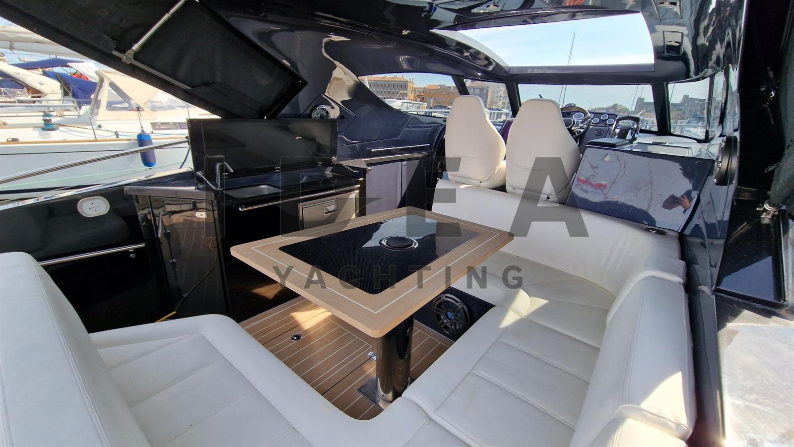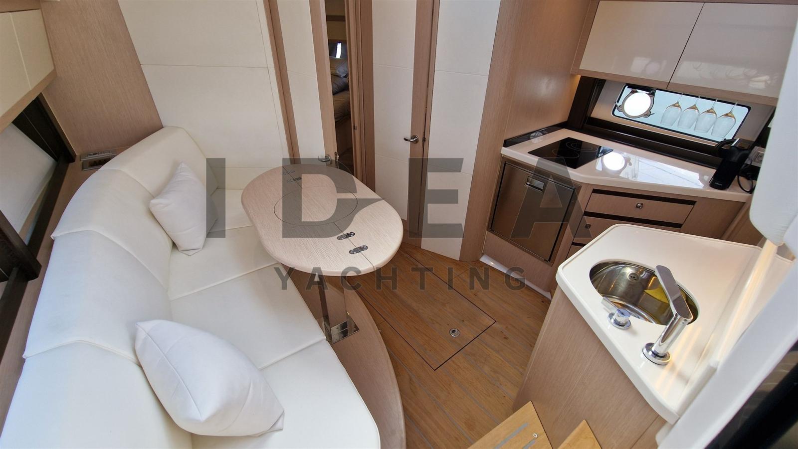 Le cockpit polyvalent est optimisé pour les loisirs en plein air. En plus d’un transat avant et de ponts latéraux sécurisés, il dispose d’un bar à bâbord, d’un poste de restauration pour six personnes, d’une chaise longue de deux mètres à l’arrière et d’un grand toit ouvrant ouvert en toile pour socialiser au soleil.