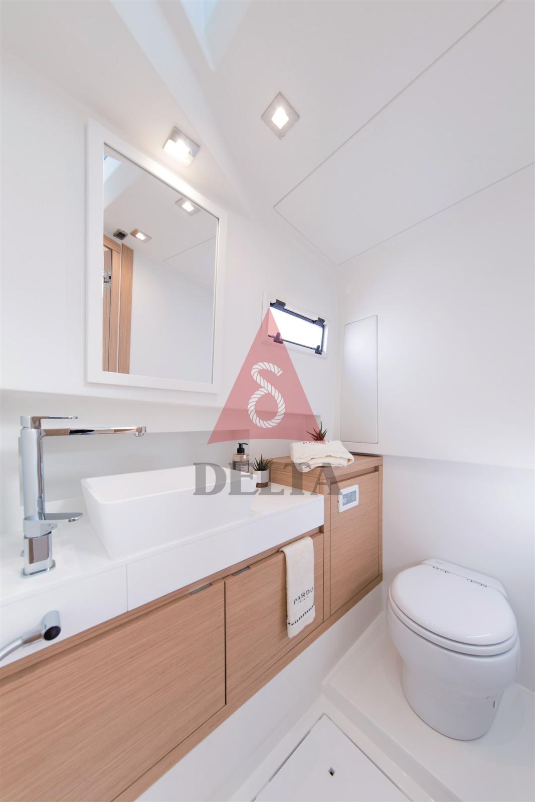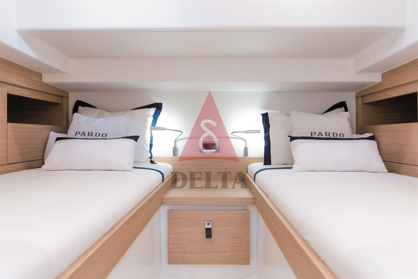 Pour les espaces intérieurs il ya deux dispositions différentes: la norme comprend une cabine avec un lit double et une salle de bains, mais deux lits simples peuvent également être ajoutés dans la zone arrière, pour former une deuxième cabine. L’environnement ouvert se caractérise par de grands volumes, des hauteurs généreuses, une luminosité abondante et une excellente ventilation, avec une distribution exceptionnelle des espaces pour un bateau de 38 pieds. La linéarité et le raffinement du mobilier sont renforcés par le choix minutieux des bois et l’attention aux détails qui font de l’intérieur du Pardo 38 une excellence du Made in Italy.