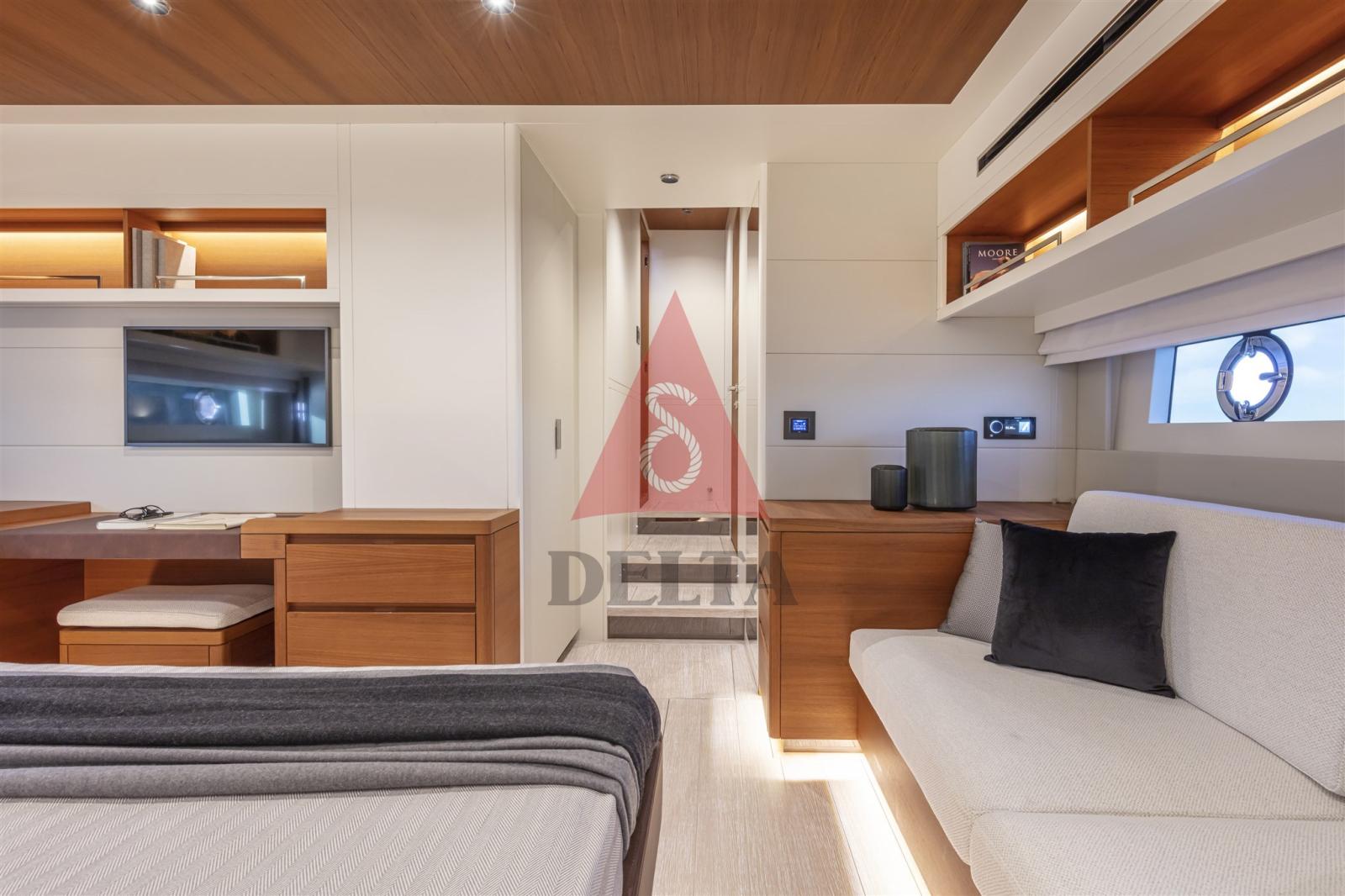 Le style de l’intérieur, frais et lumineux, couple laque blanche avec un teck blond. La continuité entre l’intérieur et l’extérieur, grâce aux grandes fenêtres d’ouverture et aux deux terrasses latérales descendantes, permet une vie à bord toujours en plein air. Parce que le vrai luxe, c’est la liberté sans frontières.