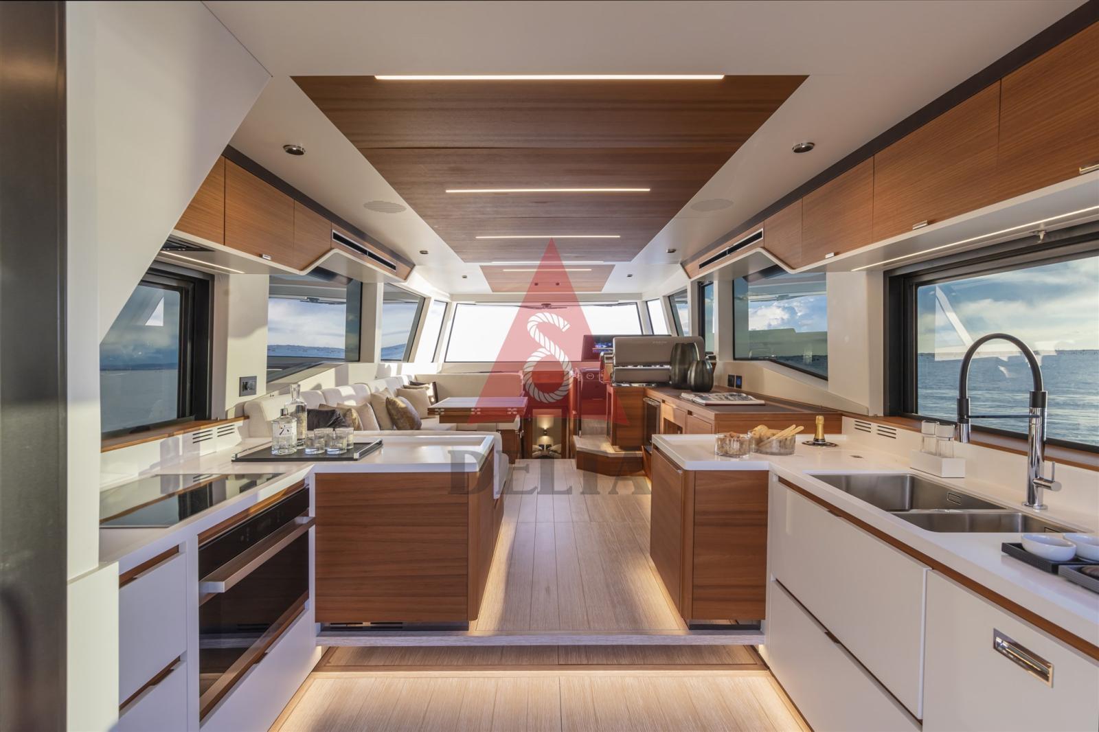 L’espace nourriture et boissons dispose de fenêtres latérales, permettant aux clients de se détendre tout en restant en contact avec la mer. La porte coulissante sépare le salon intérieur du cockpit, créant un sentiment de liberté totale dans un grand espace ouvert. La salle à manger et le salon sont surélevés, placés vers l’avant pour une vue panoramique fantastique.