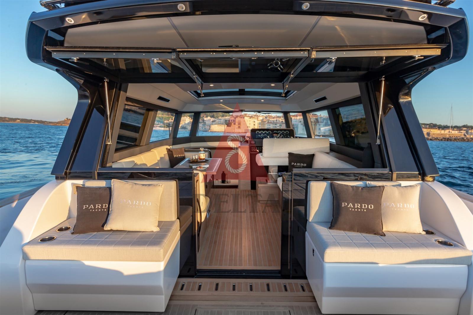 Le nouveau 52 pieds confirme un design dans lequel l’élément central est la continuité entre l’intérieur et l’extérieur. La combinaison de la porte d’accès au salon, des fenêtres latérales ouvrantes et du toit coulissant fait du pont principal du Pardo GT52 un extraordinaire loft en plein air surplombant la mer.