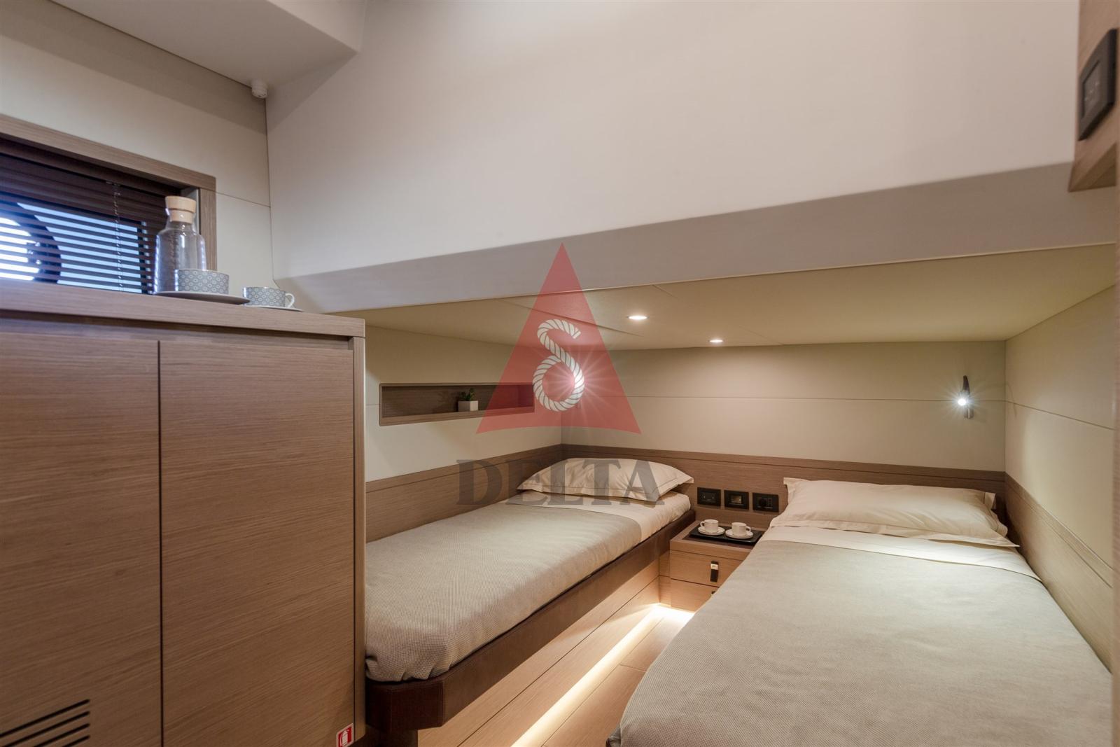 Les intérieurs signés Nauta Design sont les meilleurs de leur catégorie pour la fonctionnalité, la praticité, l’élégance et les finitions. À l’avant, la cabine principale pleine largeur est équipée d’un lit king-size avec une tête de lit latérale, ce qui permet de grands volumes et un espace de rangement supplémentaire. La grande salle de bain privée avec douche séparée est extrêmement raffinée dans les moindres détails.