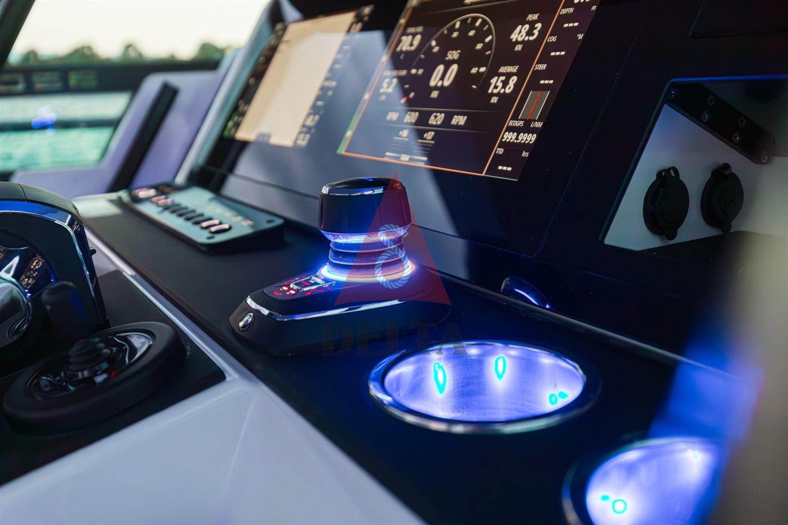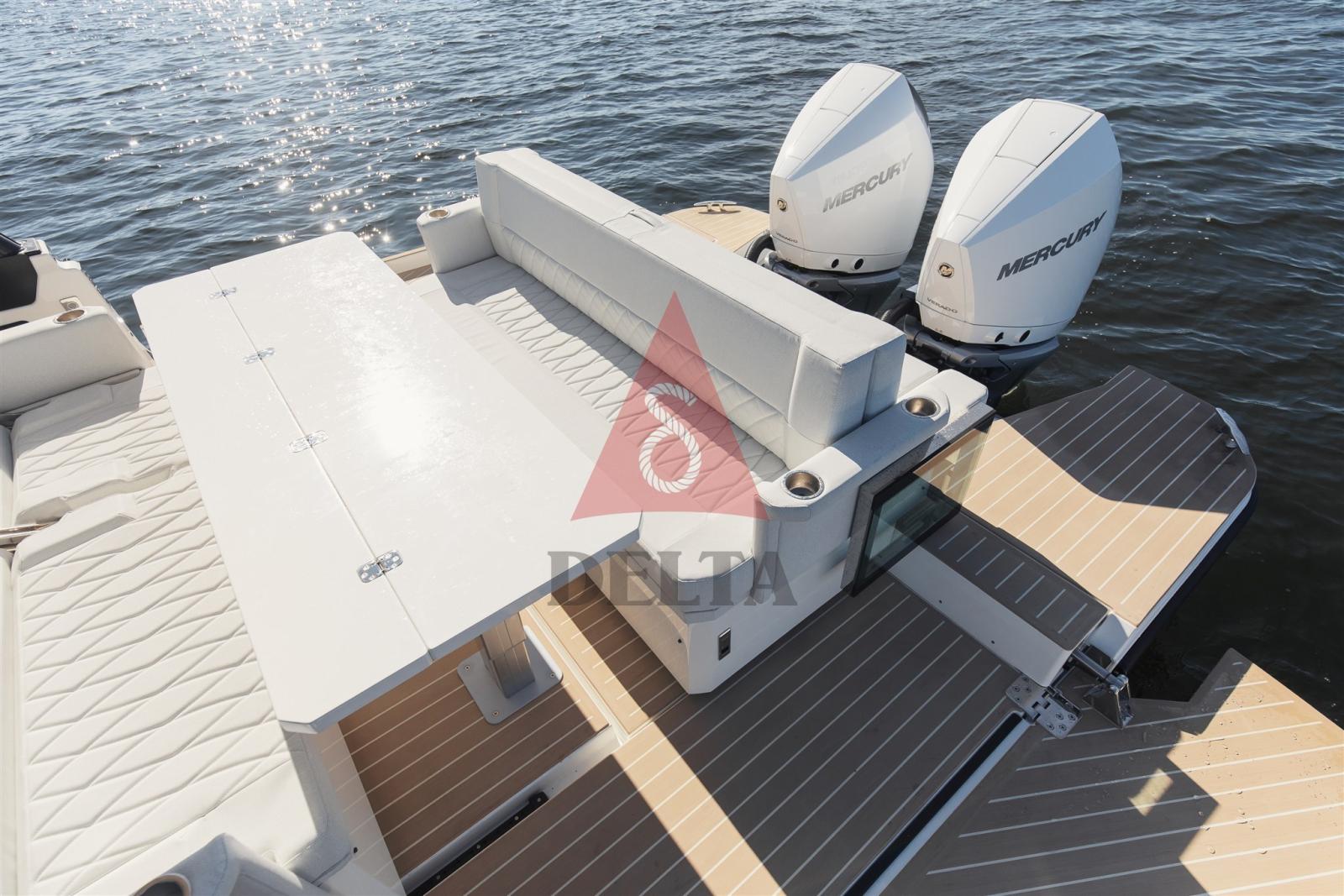 Terrasses latérales à ouverture électrique (charge maximale 150 kg) - Armoire de bar humide - Coussins d’étrave - Finitions antidérapantes sur les ponts et les écoutilles - Mains courantes intégrées sur le pont - Volets latéraux fixes pour un embarquement latéral facile - Échelle de bain télescopique - Trappes sur le pont avant pour un accès facile - 2 x Trappes encastrées - Poignées et taquets - Système de dégagement rapide des ailes - Conteneur extincteur avec trappe à feu - Table extensible avec pied télescopique - Rétroviseur dans la cabine avant - Autocollants sur la coque - Volant en cuir - Porte-gobelets dans la console et pour