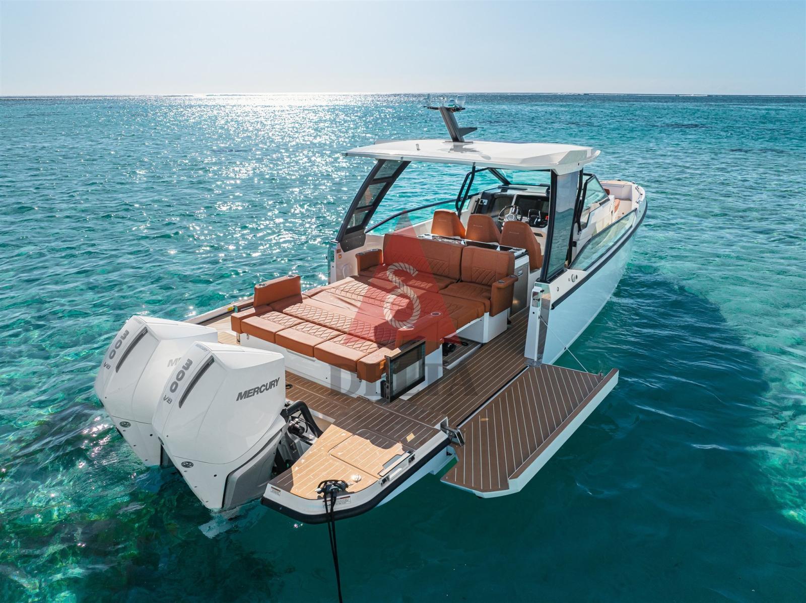 2 moteurs V8 Mercury de 300 ch (garantie 5 ans) - Direction électrique avec volant en cuir réglable - Mercury Vessel View Mobile - Mercury Active Trim.