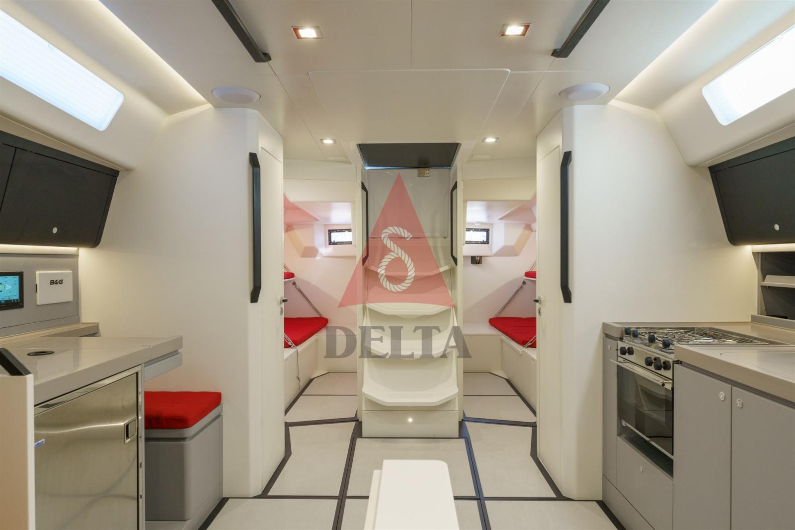 L’aménagement intérieur a été conçu pour être extrêmement polyvalent afin de passer facilement de la forme de croisière à la forme sportive et essentielle de la course.