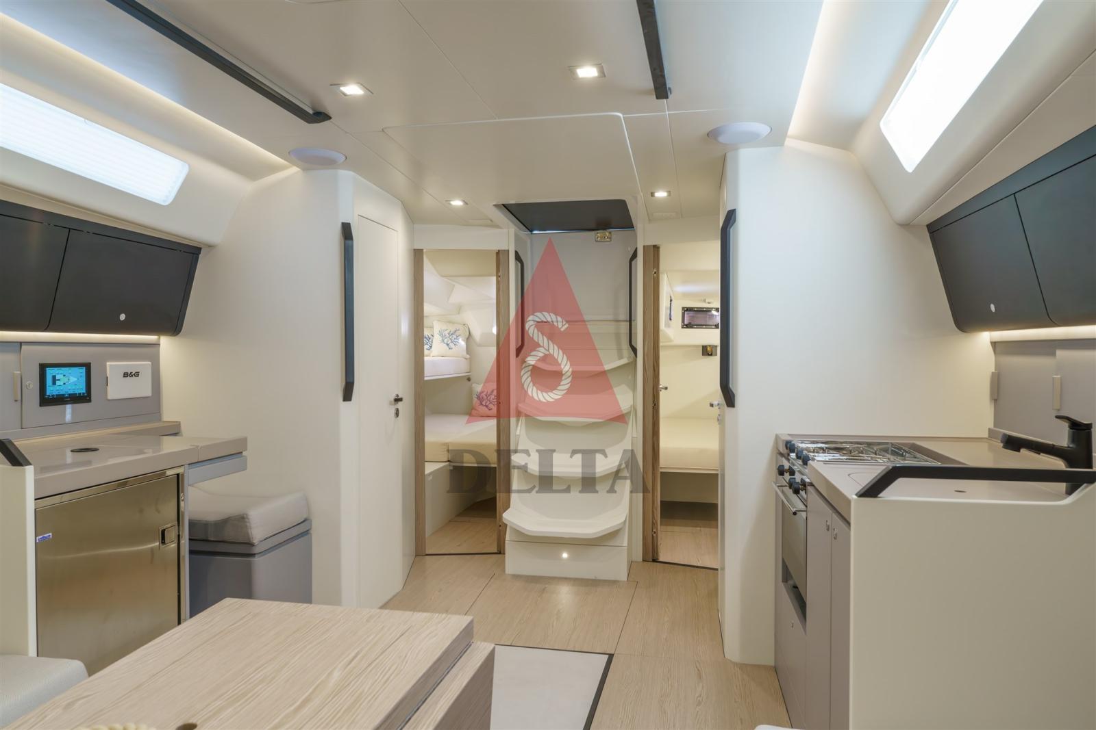 La finition intérieure sera un mélange de surfaces blanches peintes et carénées et de panneaux composites avec une finition légère, de cette façon un gain de poids considérable est obtenu par rapport à une construction traditionnelle, sans sacrifier la valeur de la menuiserie, tant dans le raffinement des finitions que dans l’excellence des détails.