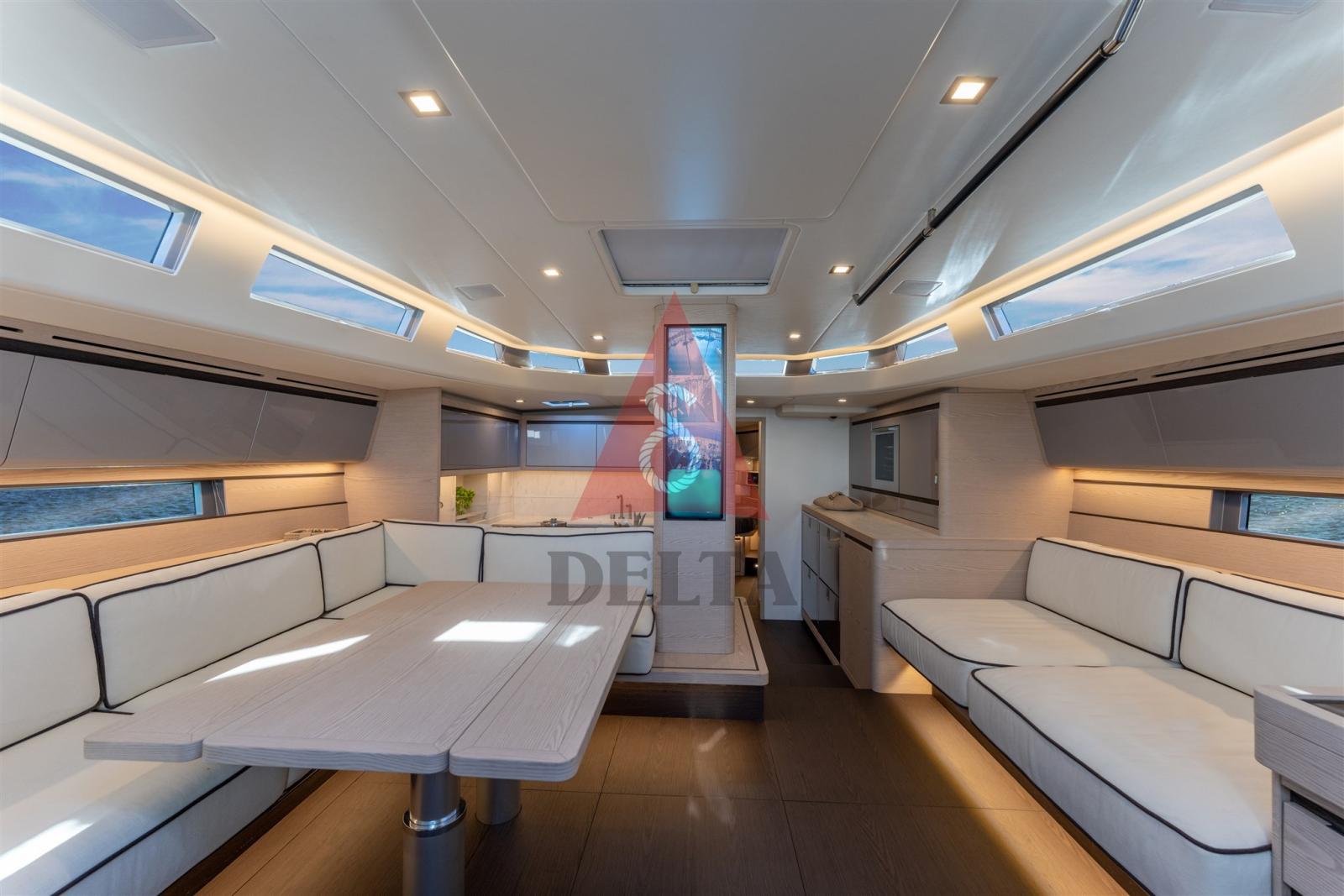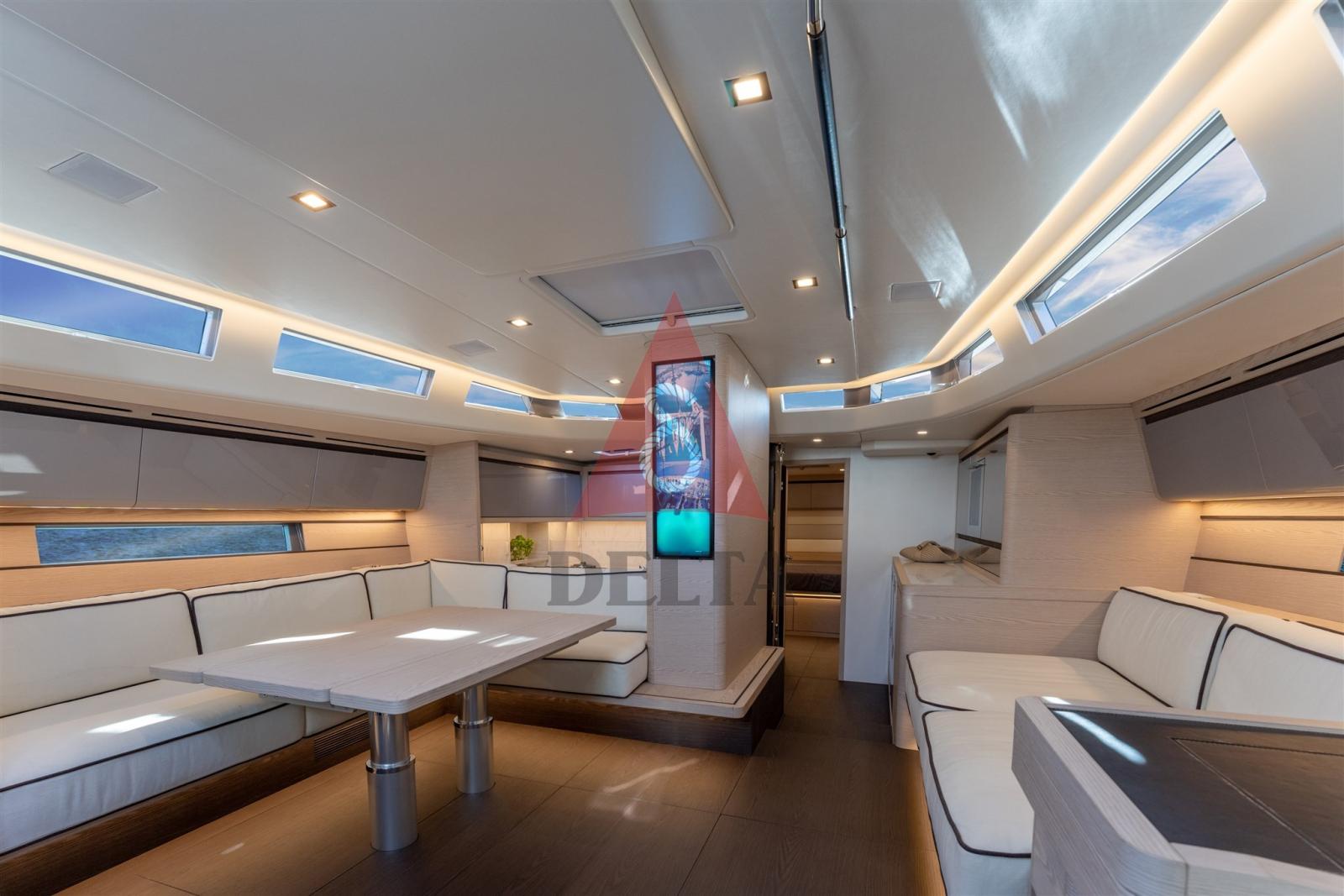 La coque et le pont sont laminés en infusion à partir d’un moule femelle, la coque est faite de fibres hybrides pour combiner la rigidité structurelle du carbone avec les propriétés naturelles de suppression du bruit et des vibrations des fibres de verre. Le pont est entièrement en carbone afin d’assurer une légèreté dans la partie supérieure et d’abaisser le centre de gravité. Les structures en carbone sont laminées sur place et également fabriquées en infusion, se fusionnant avec la coque et le pont, éliminant ainsi les grincements et bruits. Le pont, en plus du collage classique, est fixé à la coque ainsi qu’à toutes les cloisons, créant une structure monolithique et très rigide.