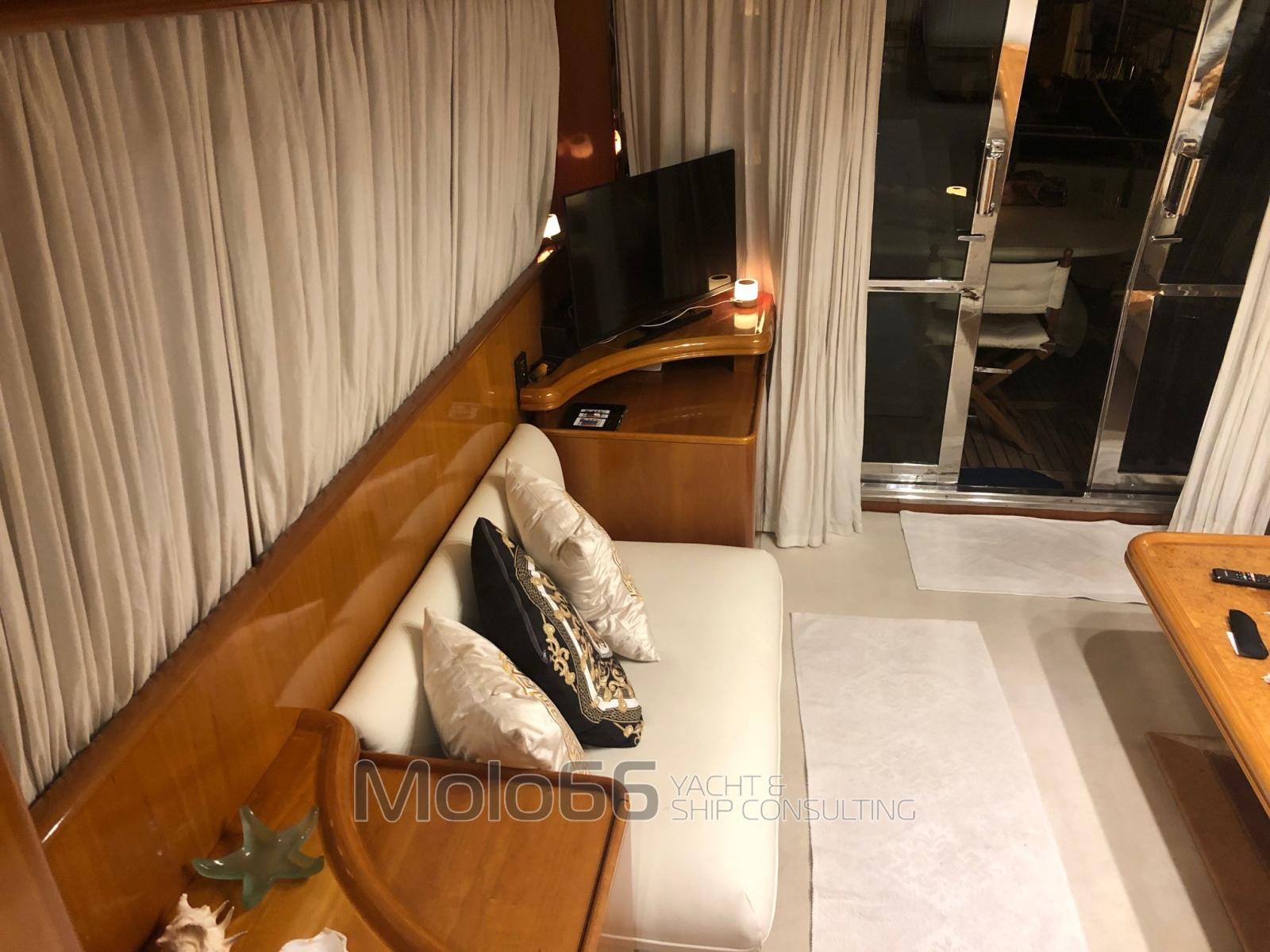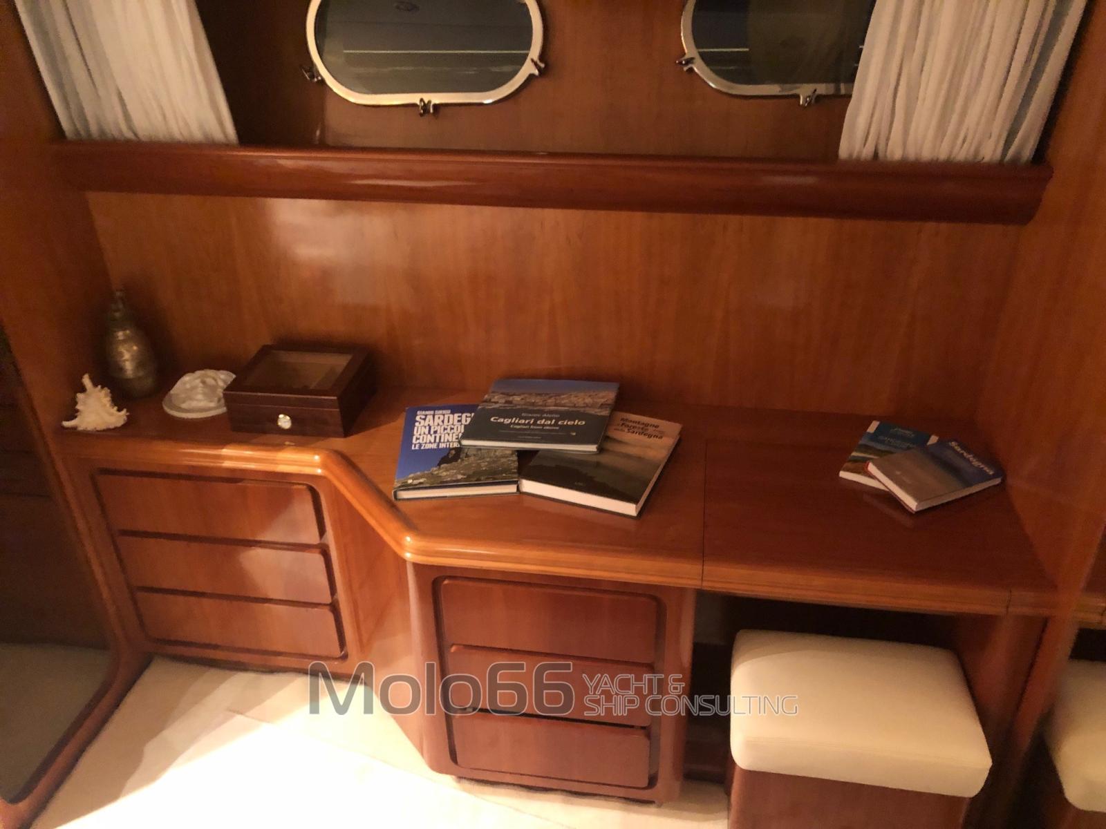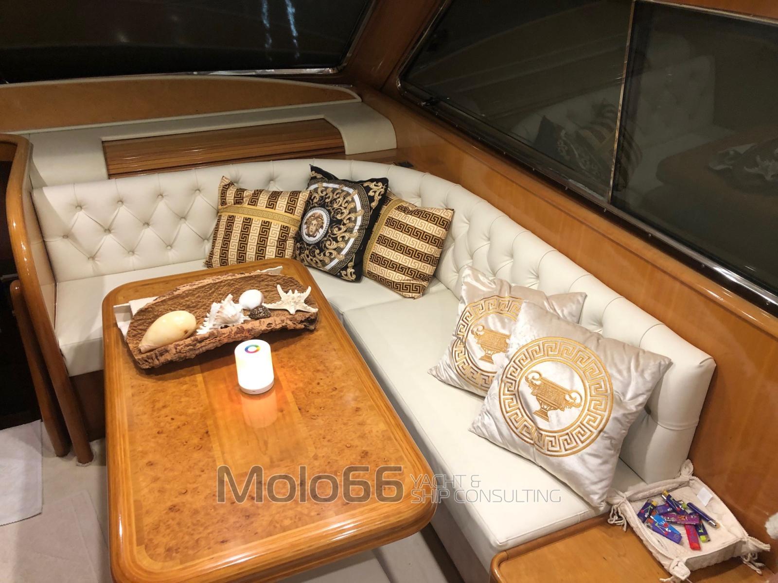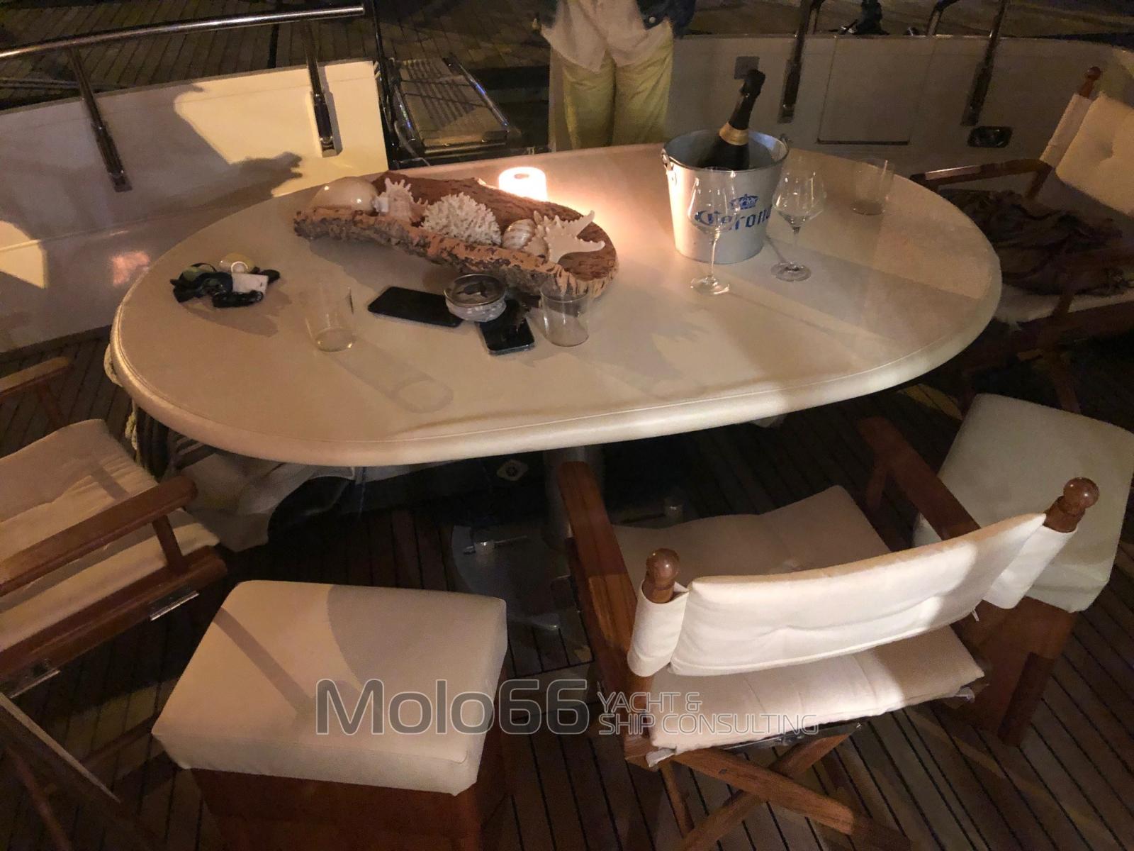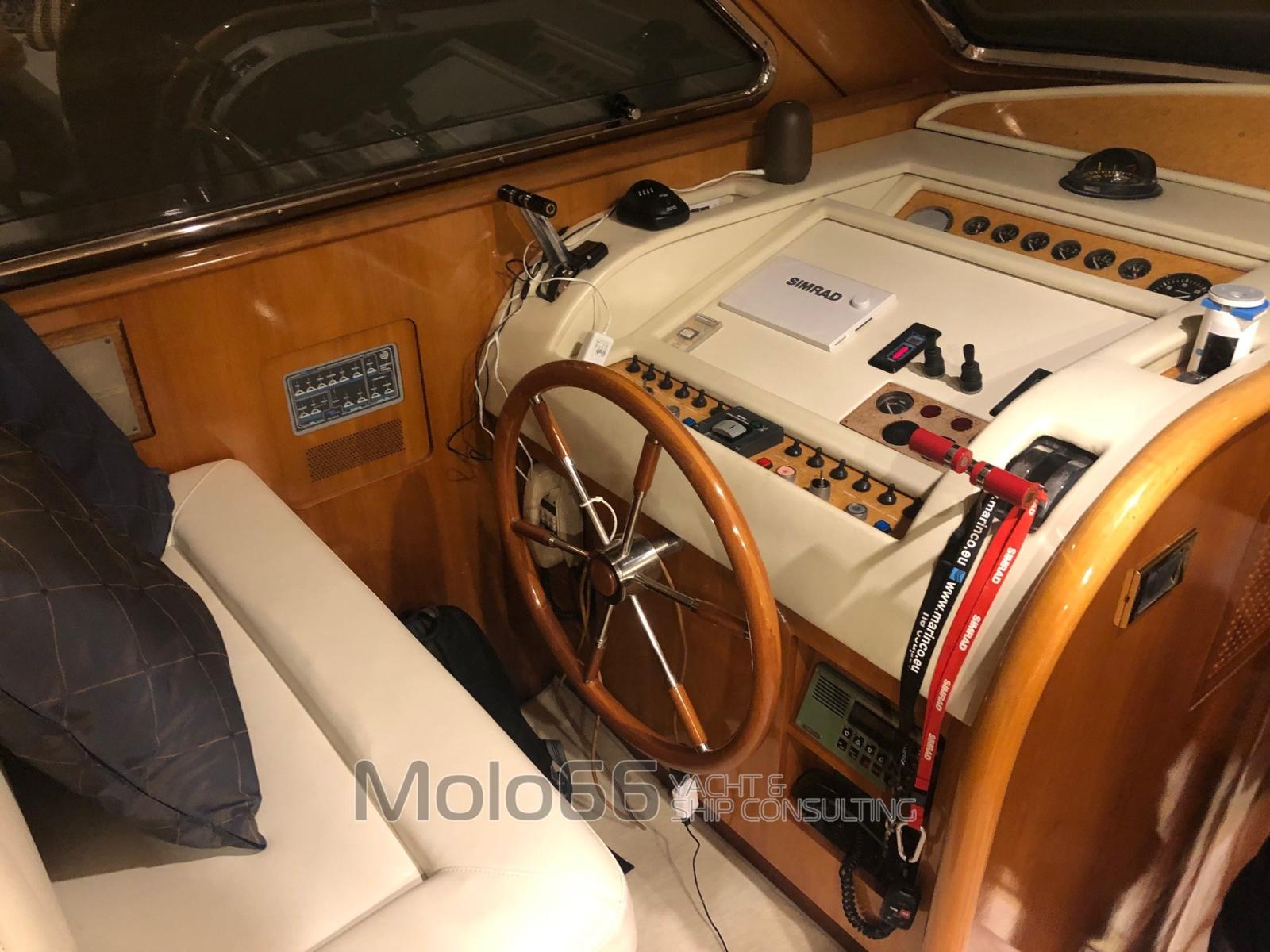 Alarme moteur, Alarme de pompe de cale, Eau sous pression, Douche de cockpit, Flaps hydrauliques, Indicateurs de flaps, Lavage de chaine, Passerelle, Plateforme arrière, Porte latérale, Porte latérale, Cockpit en teck, Prise de quai, Connexion eau sous pression à quai, Onduleur, Guindeau électrique, Echelle de bain, table de cockpit, Corne.