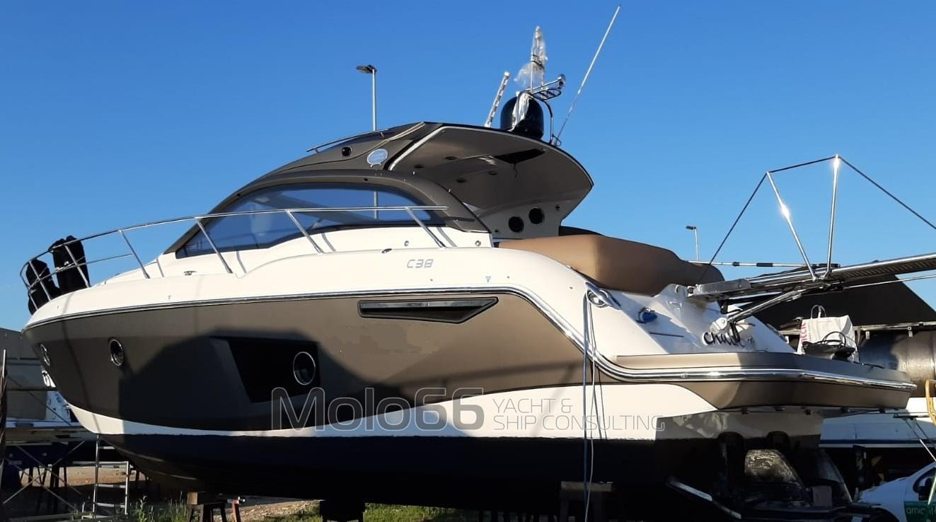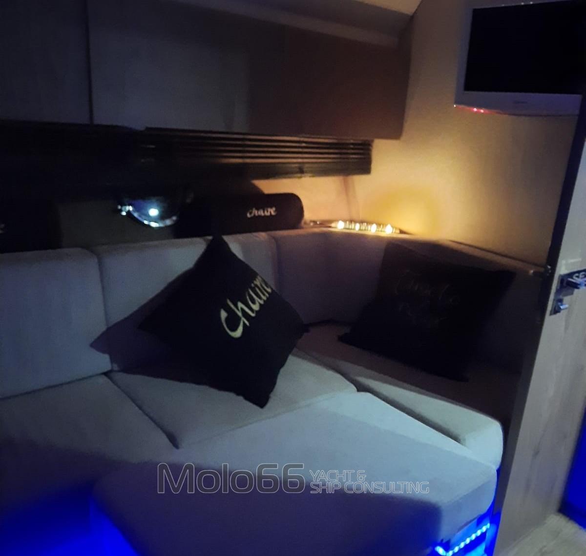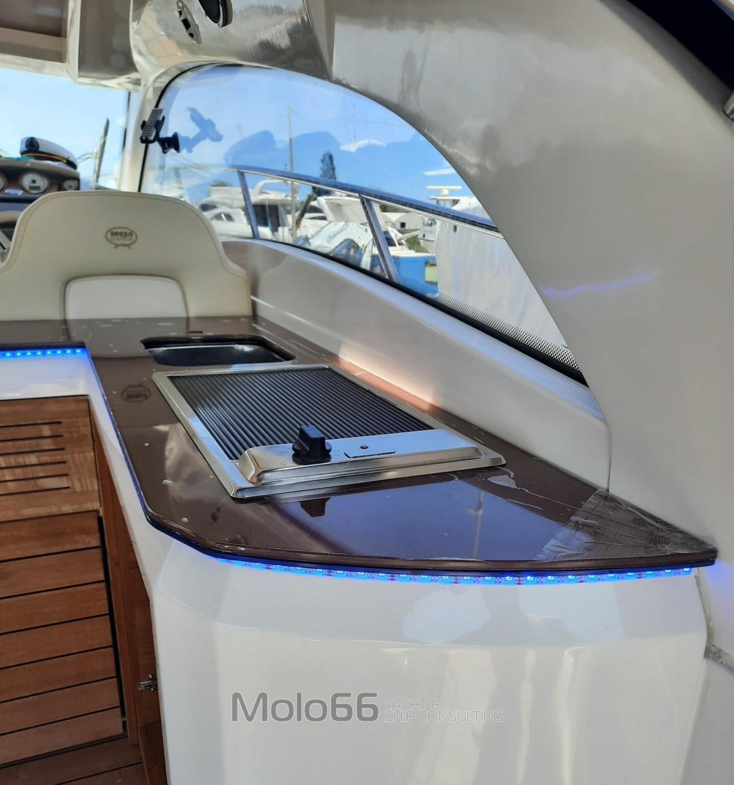 Alarme moteur, Alarme de pompe de cale, Douche de cockpit, Flaps électriques, Hard top, Extincteur(s) fixe(s), Éclairage de courtoisie, Passerelle, Plateforme arrière, Cockpit en teck, Prise de quai, Guindeau électrique, Echelle de bain, table de cockpit.