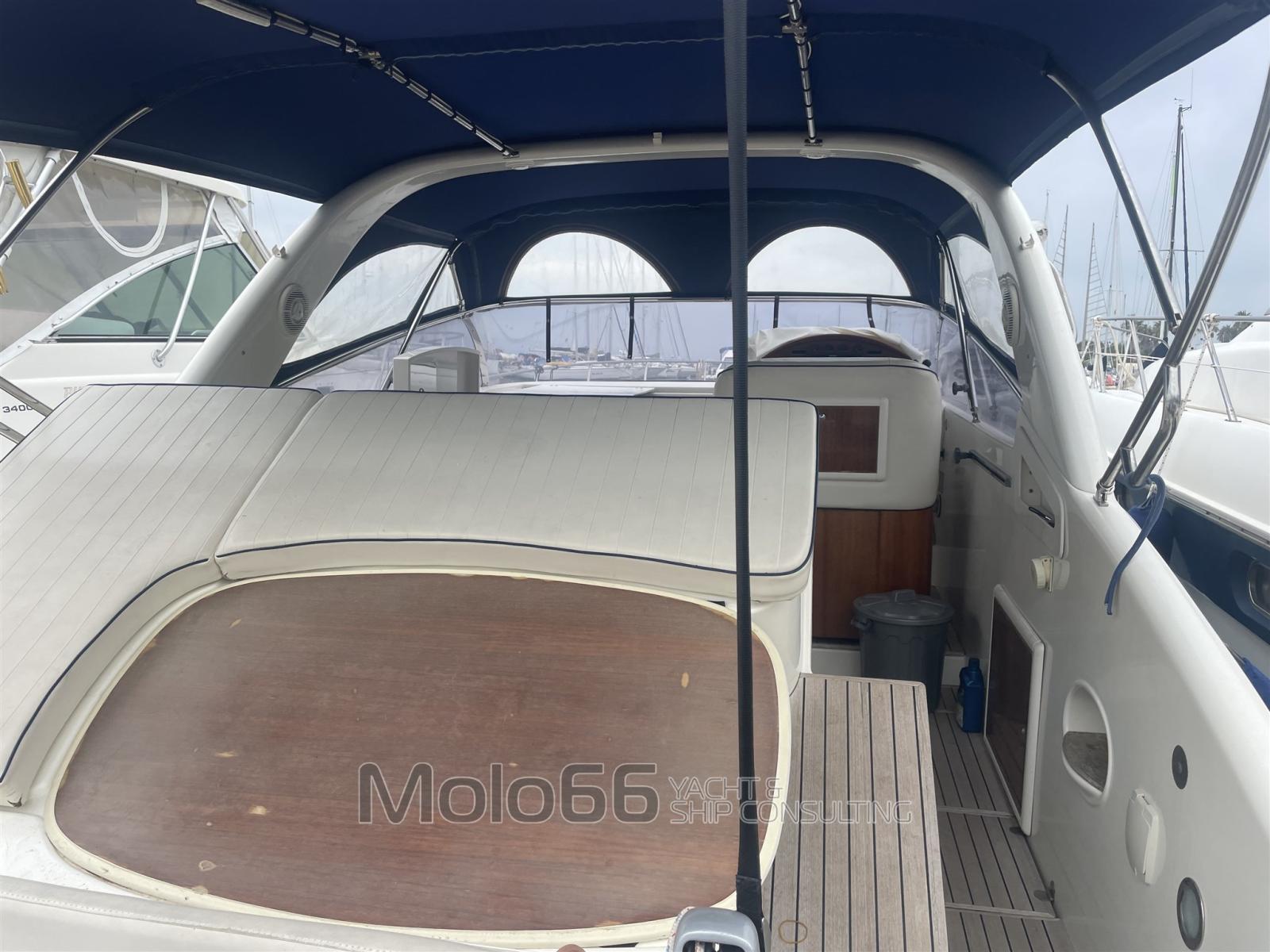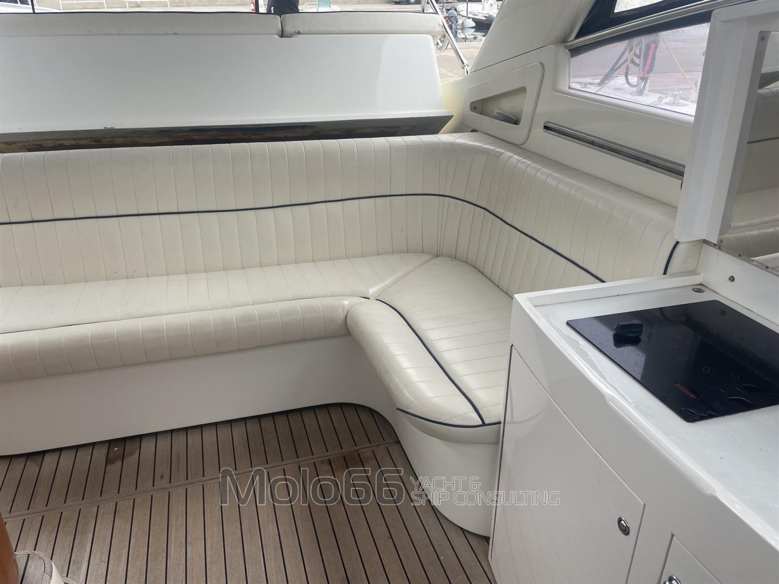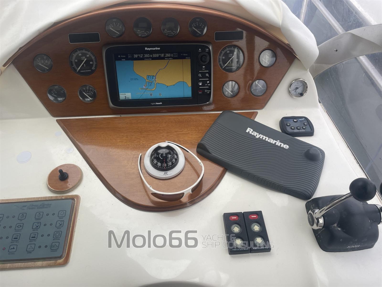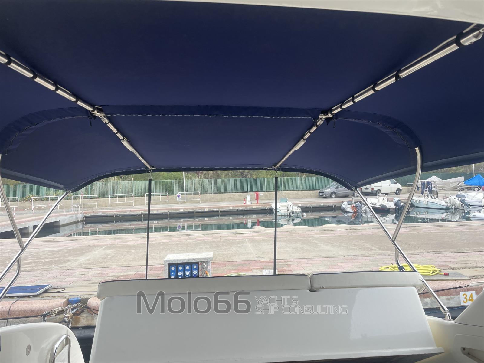 Alarme gaz, Alarme moteur, Alarme de pompe de cale, Eau sous pression, Radeau de sauvetage (ZATTERA EUROVINIL COSTAL), Couleur spéciale (Blu navy), Douche de cockpit, Extincteur(s) fixe(s), Plateforme arrière, Cockpit en teck, Prise de quai, Connexion eau sous pression à quai, Guindeau électrique, Echelle de bain, table de cockpit, Annexe (PLASTIMO), Corne.