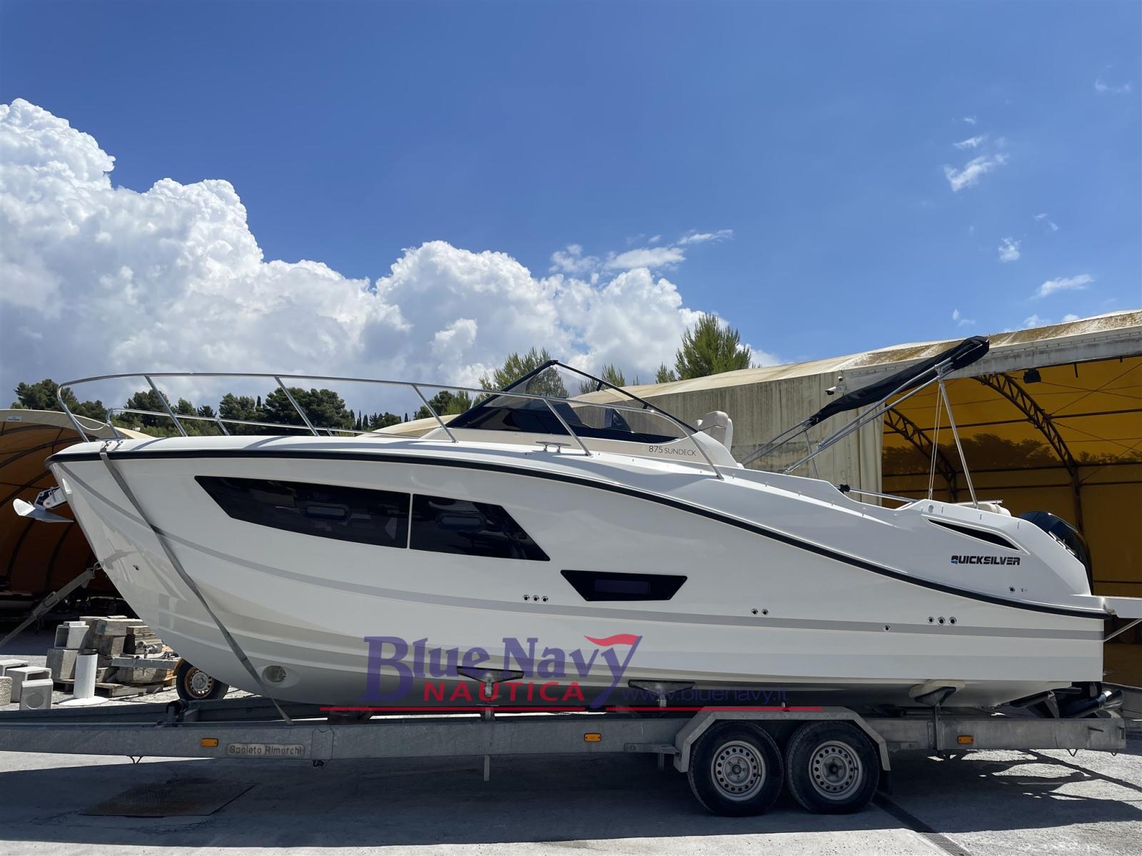 Quicksilver 875 Sundeck - Le bateau DEMO a été exposé au salon nautique de Gênes 2025 - propulsé par une paire de moteurs V8 VERADO blancs Mercury 250cv, en plus de l’équipement standard, il est équipé des options suivantes : Smart Pack (siège rabattable à droite, siège pilote inclinable, bain de soleil dans le cockpit, rideaux dans la cabine, réfrigérateur, four à micro-ondes, réfrigérateur, cuisinière GPL, kit d’amarrage), extension des plates-formes arrière, stéréo (4 haut-parleurs), double GPS/ECO Simrad EVO3S 9° avec HDI, transducteur VHF, treuil d’étrave électrique, volets électriques, prise électrique sur le quai, propulseur d’étrave, auvent, bâche d’amarrage, housse de tableau de bord et sièges.