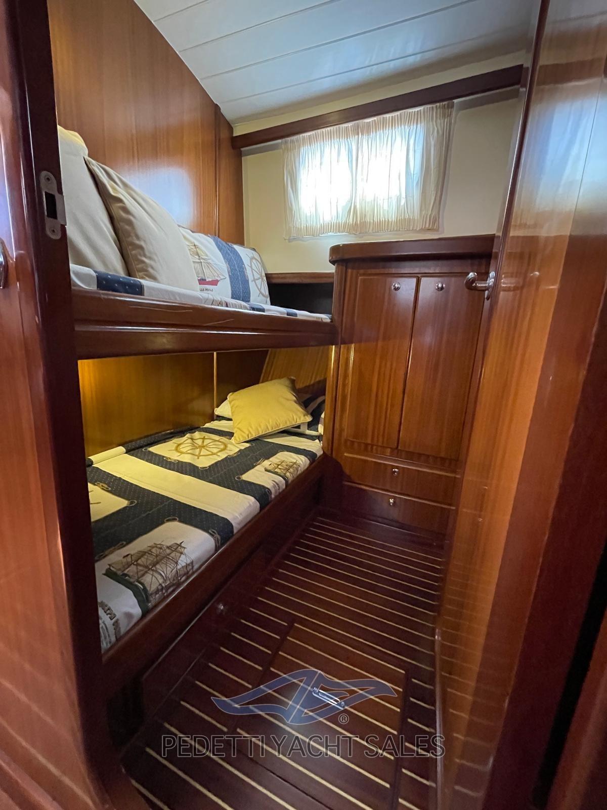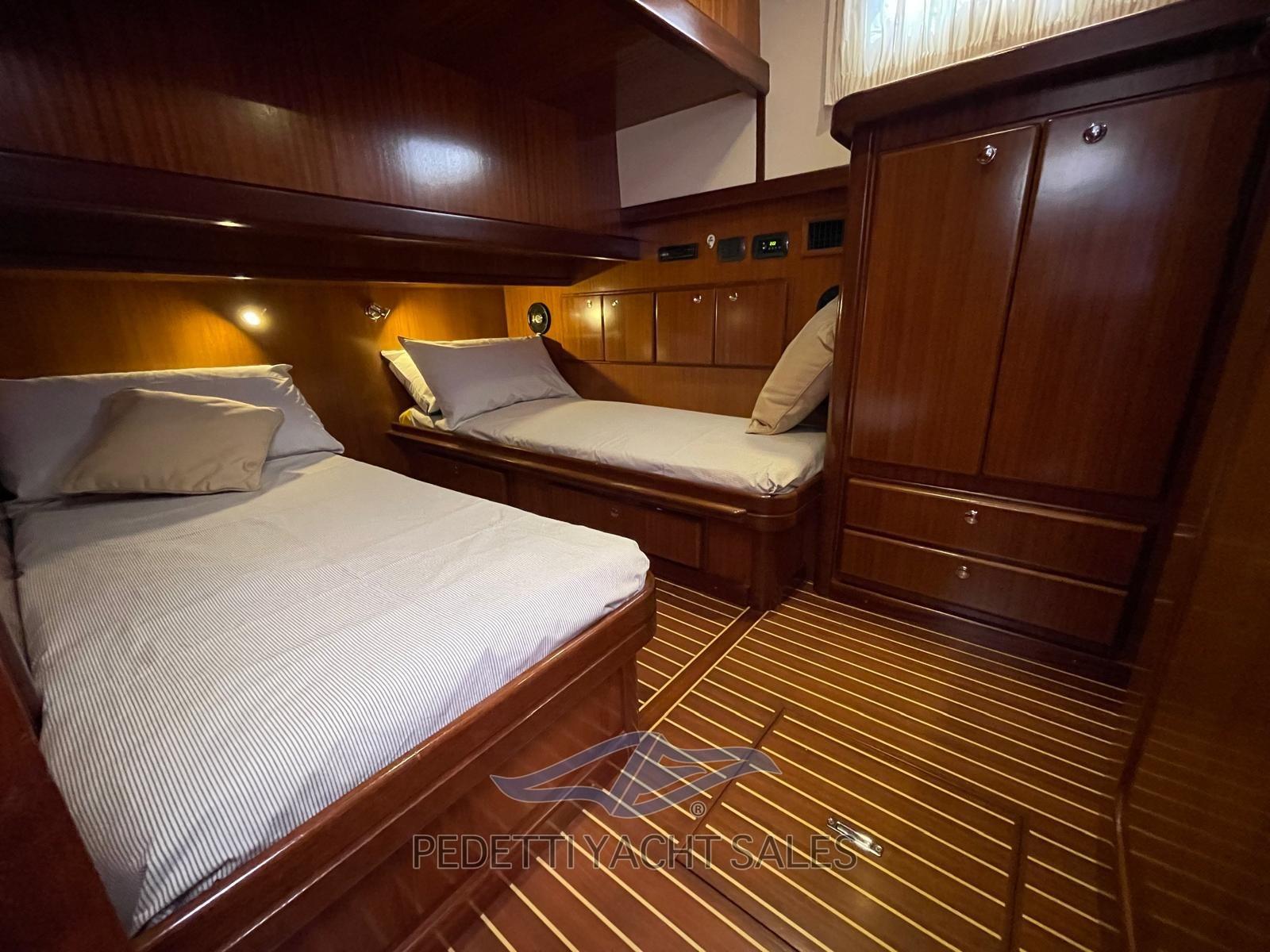 Électronique complète avec radar et instruments à vent, ponts latéraux et laits en teck 2021, coque entièrement repeinte en 2021, onduleur, générateur Onan 6Kw à zéro heure en 2021, climatisation avec refroidisseur, propulseur avant et propulseur arrière (ce dernier 2021), coussins extérieurs 2021, siège canapé avant avec coussins, auvent avant et passerelle bimini 2019, panneaux de protection des vitres 2021, sièges/casiers dans le cockpit, grand pont solaire personnalisé sur le pont de rechange, batteries 2021, système TV, double réfrigérateur avec congélateur, balise pirate, stéréo hi-fi dans toutes les pièces, échangeurs d’air 2021, nouveaux joints d’essieu 2024, table ouvrante 120x60 (120x120) avec fauteuils