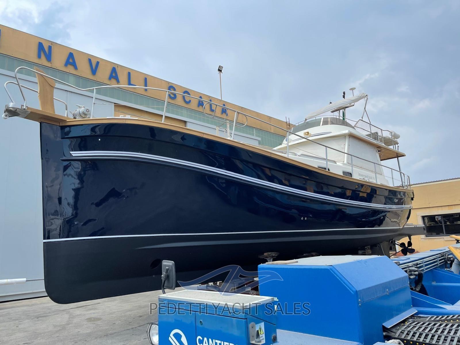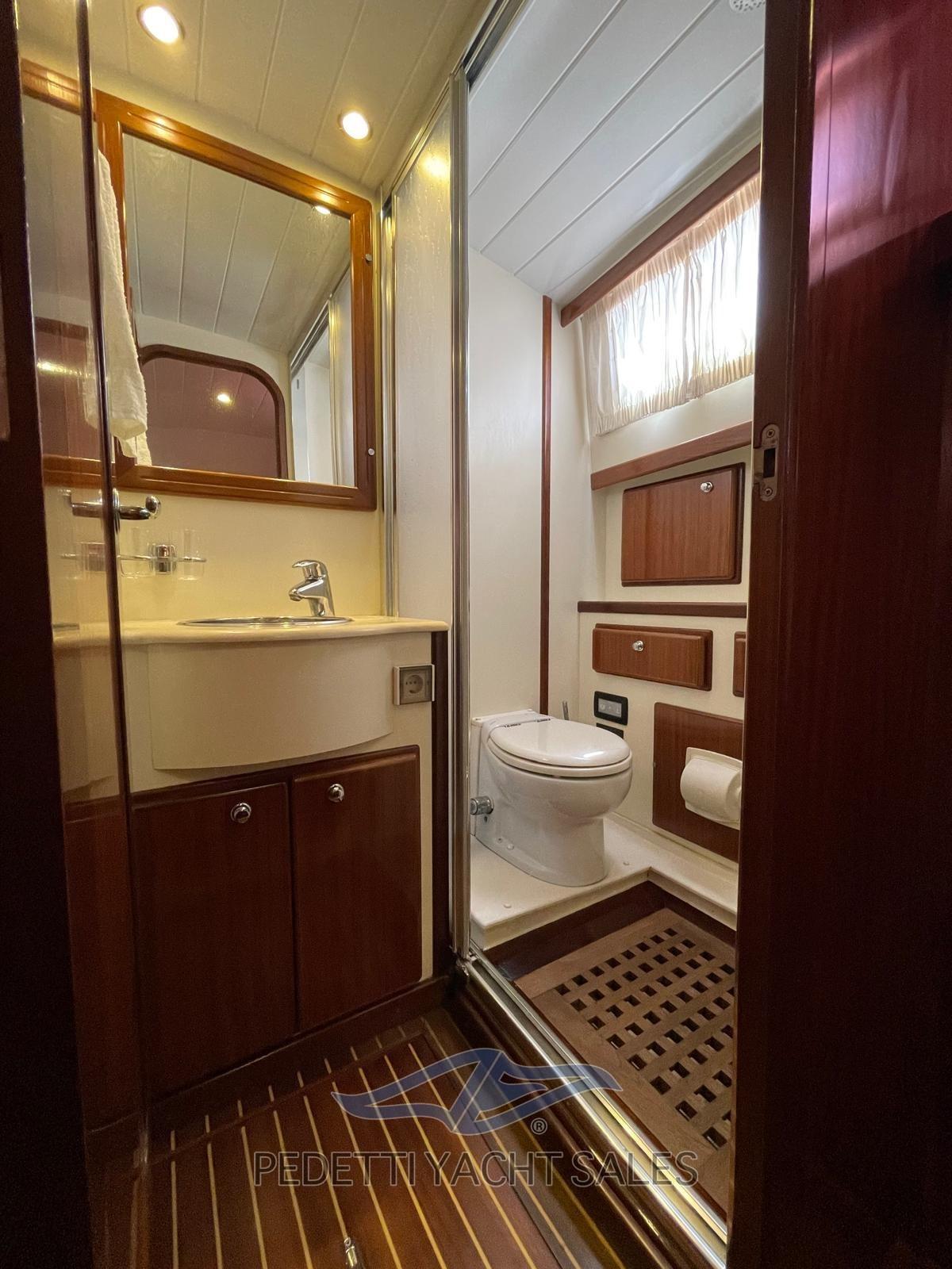 Alarme moteur, Alarme de pompe de cale, Eau sous pression, 6 Batteries, Passavant en teck, Couleur spéciale (blu), Douche de cockpit, Double barre à roue, Phare de poursuite, Passerelle (idraulica), Pompe de cale automatique, Cockpit en teck, Prise de quai, Guindeau électrique, Echelle de bain.