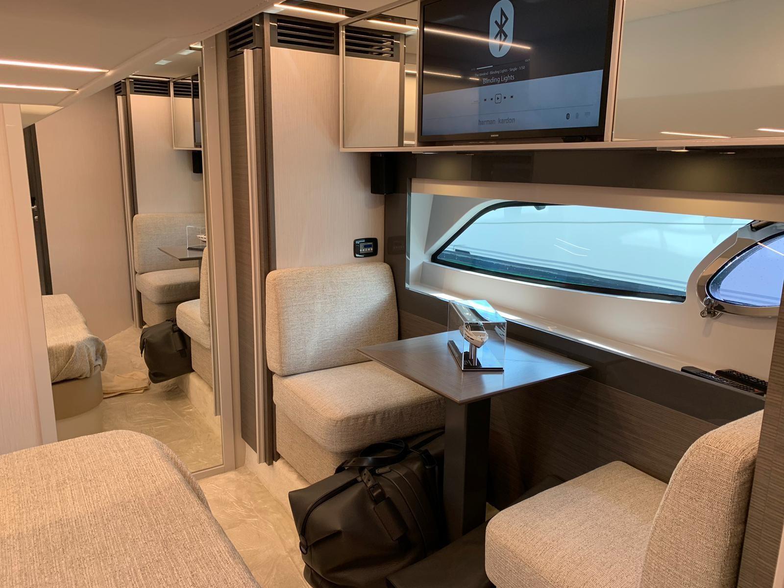 Cette Pershing 5X de 2021 est en ÉTAT NEUF, seulement 195 heures de moteur sur son Twin Volvo Penta D11 IPS 950 (725 ch chacun, ce qui lui donne une vitesse maximale de 36 Kts et une vitesse de croisière de 31 Kts avec une autonomie de 300 NM). Elle est le modèle 3 cabines, une cabine double VIP Bow (avec salle de bains en tête agissant ainsi que la tête de jour), une cabine double principale au milieu du navire (avec salle de bains principale) et une cabine double superposée en face de la cuisine.