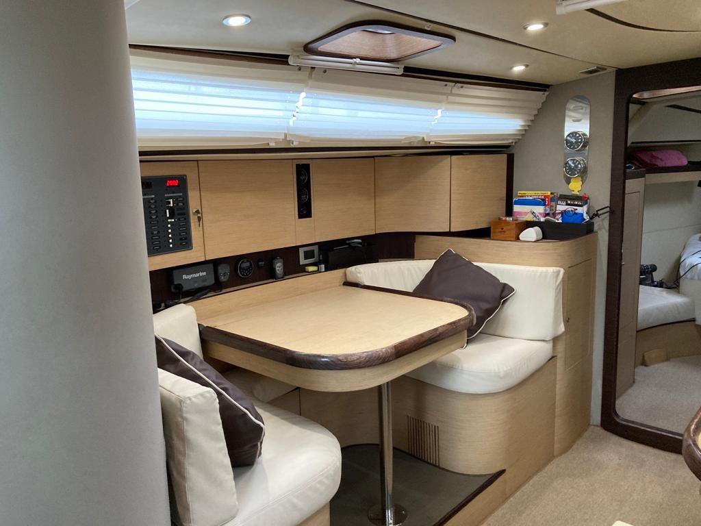 Zone à cartes avec table et deux fauteuils opposés à bâbord