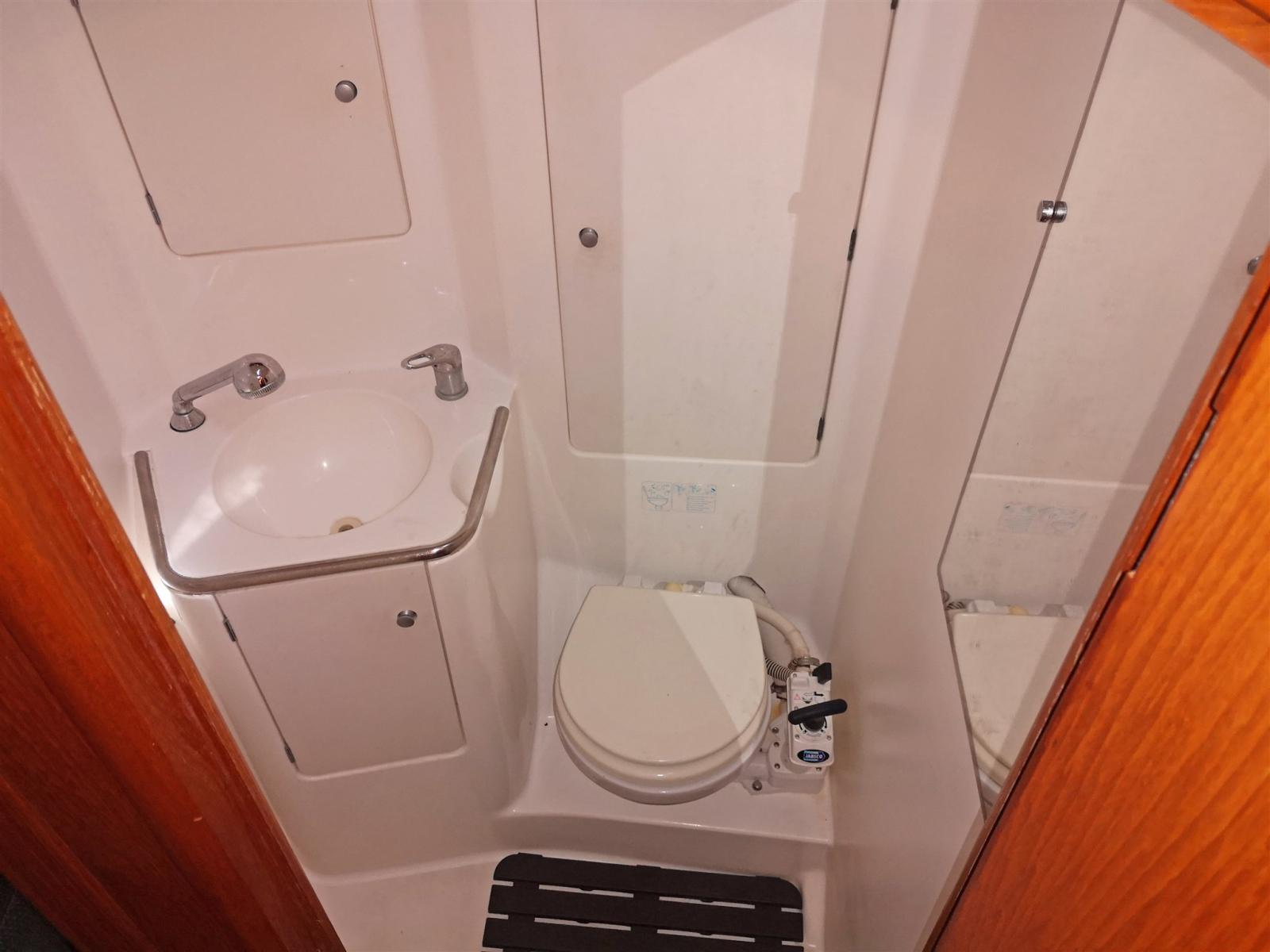 Cabine principale avec lit double et salle de bain attenante avec lavabo, toilettes manuelles et douche avec vidange électrique