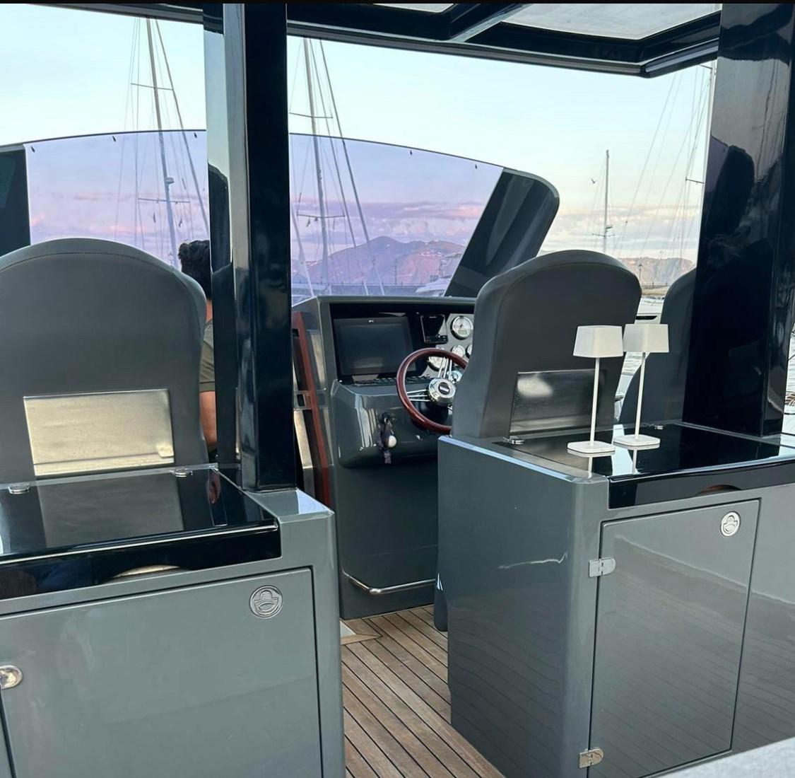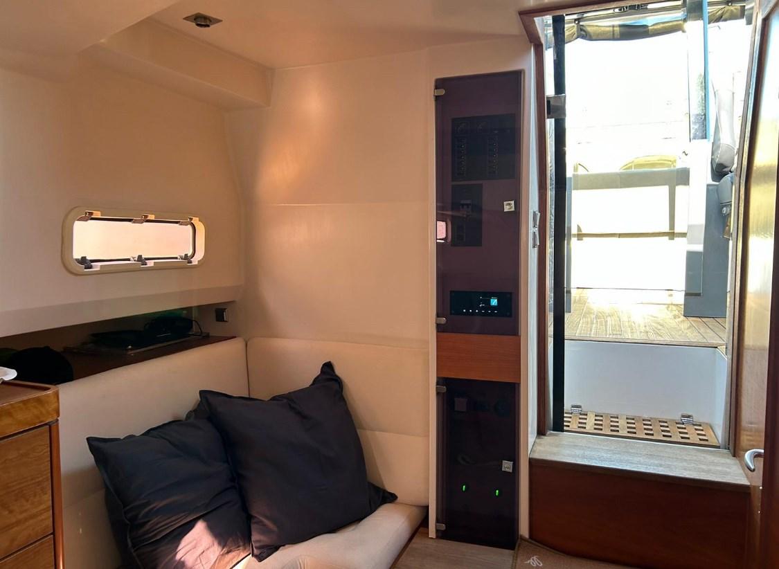 Alarme moteur, Alarme de pompe de cale, Ancre (10kg + 50m SS chain with hydraulic arm system), Eau sous pression, 6 Batteries (2x90 Ah (engines) + 4x160 Ah AGM (service)), 6 Taquets pliants, Système de vidange, Passavant en teck, Douche de cockpit, Flaps électriques (Volvo trim tabs), Extincteur(s) fixe(s) (firebuoy), Indicateurs de flaps, Lavabo dans le cockpit, Éclairage de courtoisie ((Option)), Spots sous-marins ((Option)), Plateforme arrière (extended and fixed), 2 Pompe de cale automatique, Porte latérale (sliding), Cockpit en teck, Prise de quai, Guindeau électrique, Echelle de bain, table de cockpit (on electric pedestal convetible into sunpad), 2 Filières avec sortie latèrale, Corne, T-Top (painted Jet black).