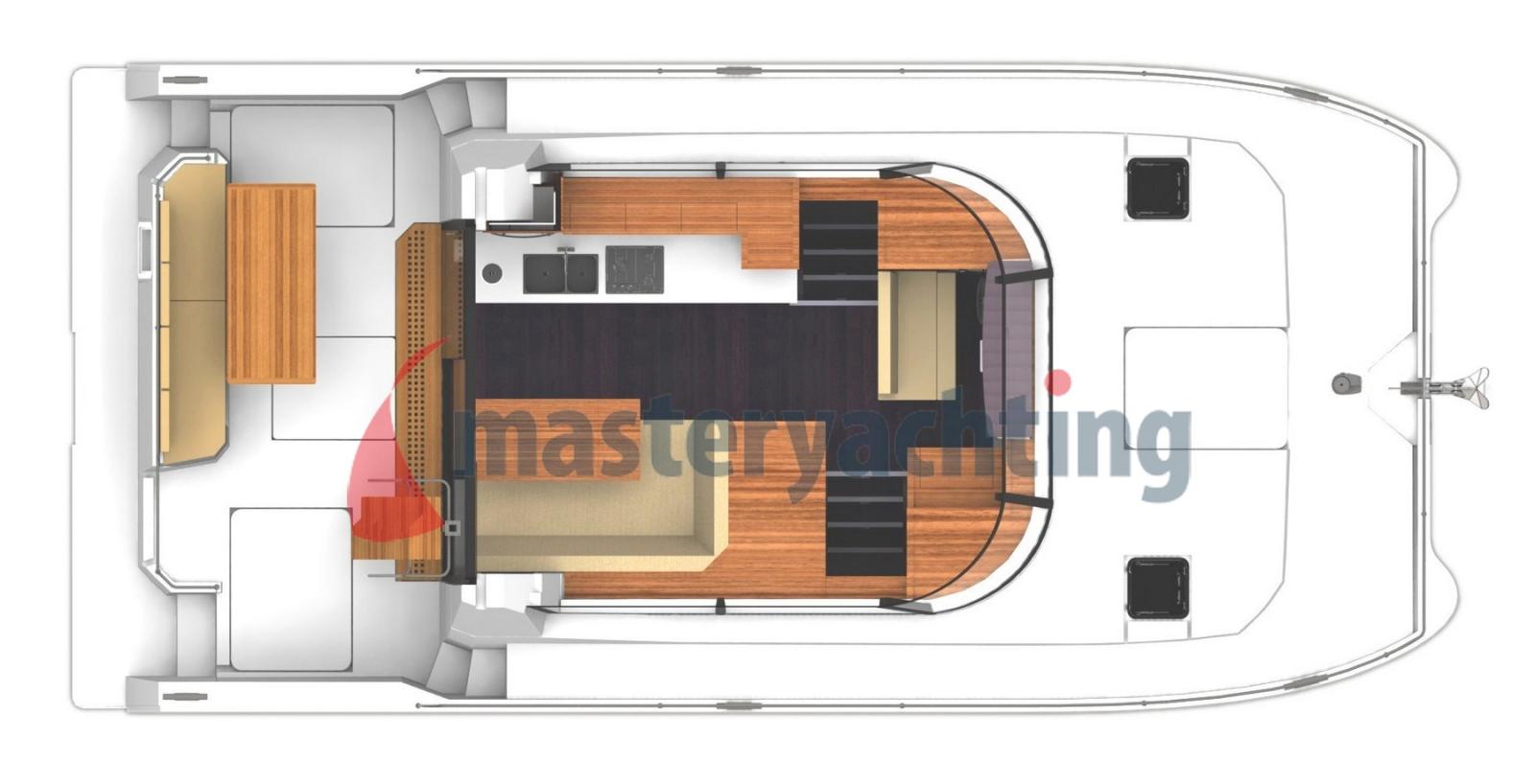 Alarme moteur, Eau sous pression, Chargeur de batterie (12 volt 80 amps), Douche de cockpit, Double barre à roue, Éclairage de courtoisie, Moteur d'annexe, Plateforme arrière (hydraulique immergeable), Pompe de cale automatique, Prise de quai, Guindeau électrique (Quick 100 w), Echelle de bain, table de cockpit, Annexe.