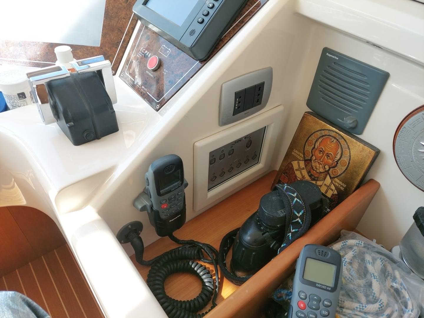 Eau sous pression, Système de vidange, Douche de cockpit, Double barre à roue, Flaps hydrauliques, Extincteur(s) fixe(s), Indicateurs de flaps, Éclairage de courtoisie, Passerelle, Plateforme arrière, Pompe de cale automatique, Pompe de cale manuelle, Porte latérale, Cockpit en teck, Prise de quai, Répétiteur électronique, Rollbar, Guindeau électrique, Echelle de bain, table de cockpit, Corne, Winch électrique arrière, Winch électrique avant.