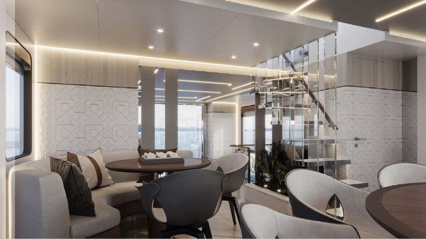 La grande plate-forme de baignade arrière, bordée de pavois surélevés, abrite une plate-forme submersible, ce qui donne à cette zone une fonctionnalité supplémentaire de zone de plage. Un cran plus haut se trouve le cockpit meublé, protégé par le porte-à-faux du flybridge au-dessus. À l’intérieur, chaque aspect est soigné avec une attention scrupuleuse aux détails, des tables rondes qui créent une atmosphère conviviale, au salon équipé de canapés confortables en passant par la cuisine équipée d’appareils électroménagers de dernière génération. Sur le flybridge, un second salon meublé prend vie, aménagé en bain de soleil et utilisable comme une grande terrasse surélevée surplombant la mer.
