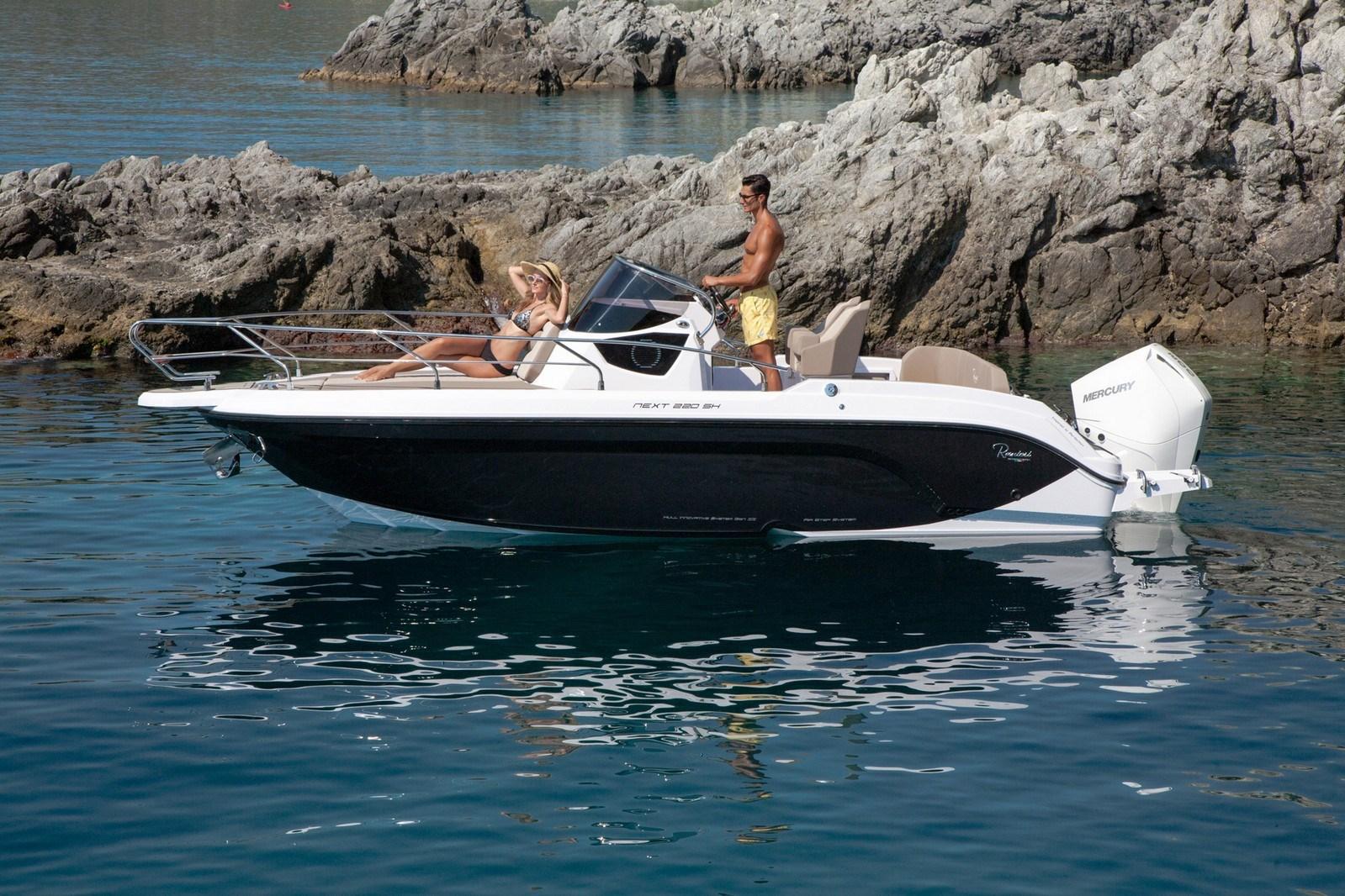 Il est possible de se détendre sur un bain de soleil rétractable en utilisant les sièges rabattables et en faisant pivoter les sièges de direction à 360°. La proue allongée abrite une terrasse confortable pour trois personnes tandis que le bateau dauphin donne de la solennité à l’ensemble du bateau. Le pont offre une cabine confortable avec un coin repas qui se transforme en lit double et un espace où il est également possible d’insérer un réfrigérateur à tiroir. Le coffre tribord dissimule les toilettes électriques.