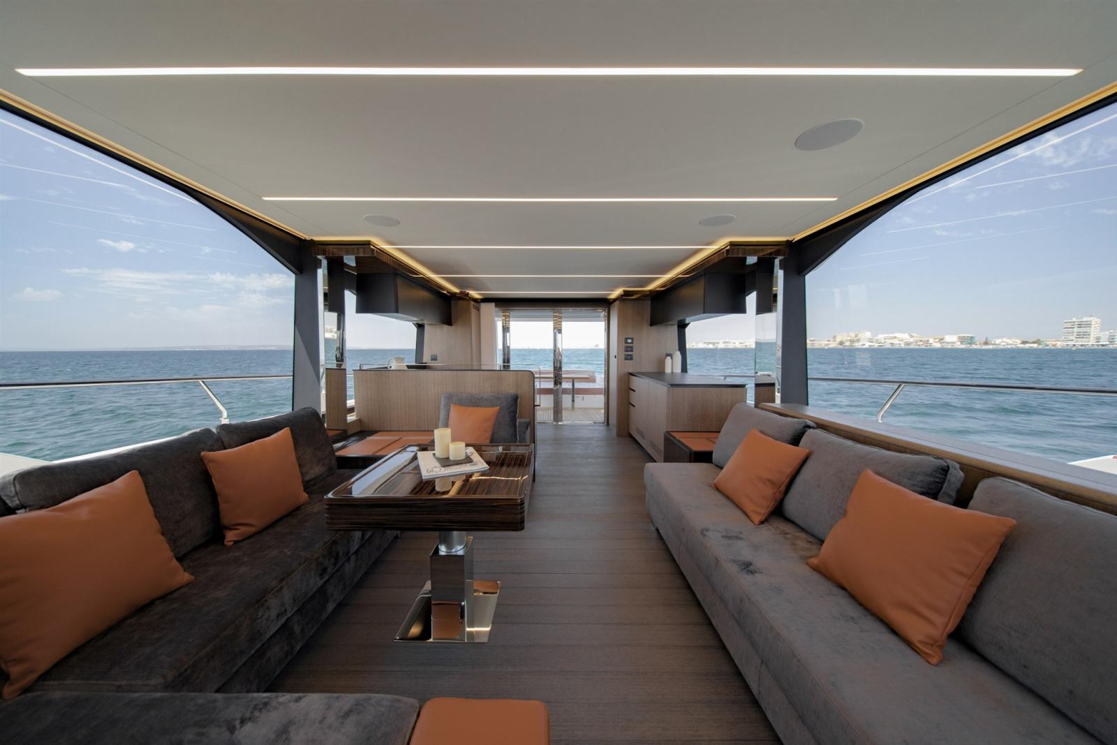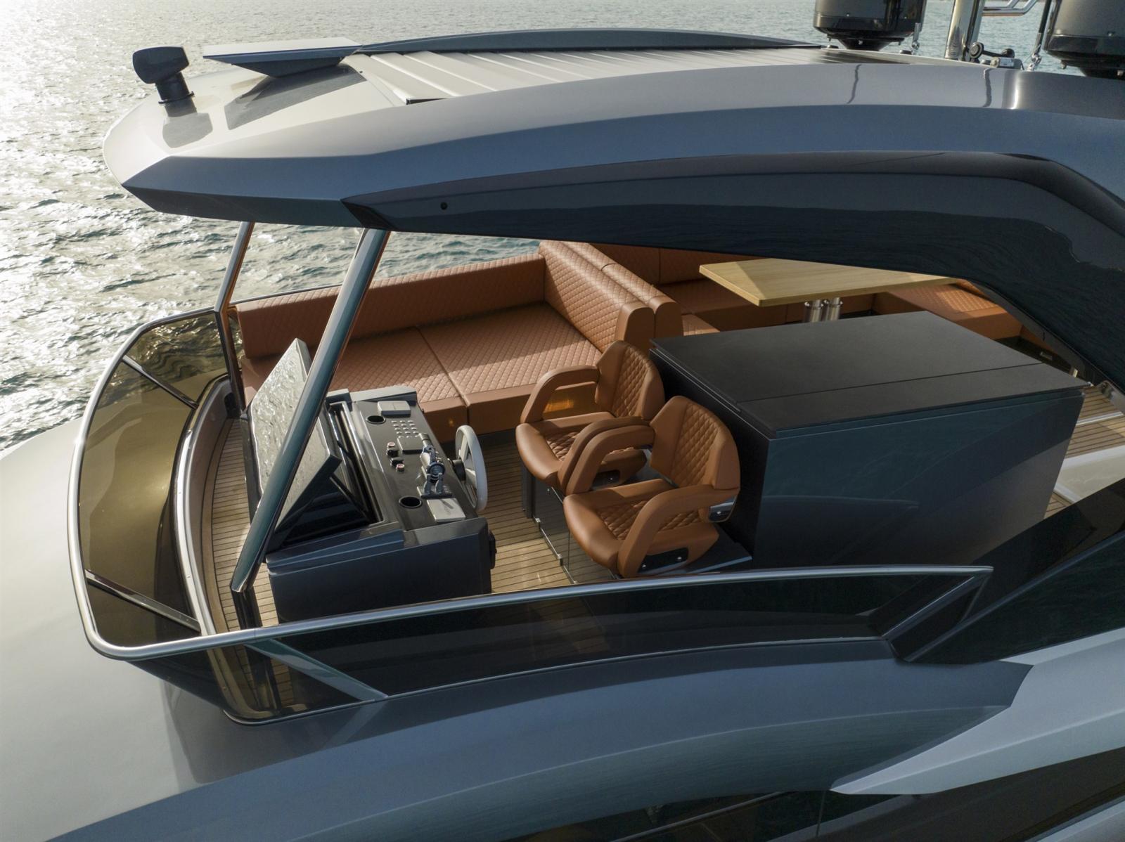 Le flybridge peut être personnalisé et est équipé d’un poste de pilotage avec un toit ouvrant derrière lequel se trouve une dînette extérieure.
