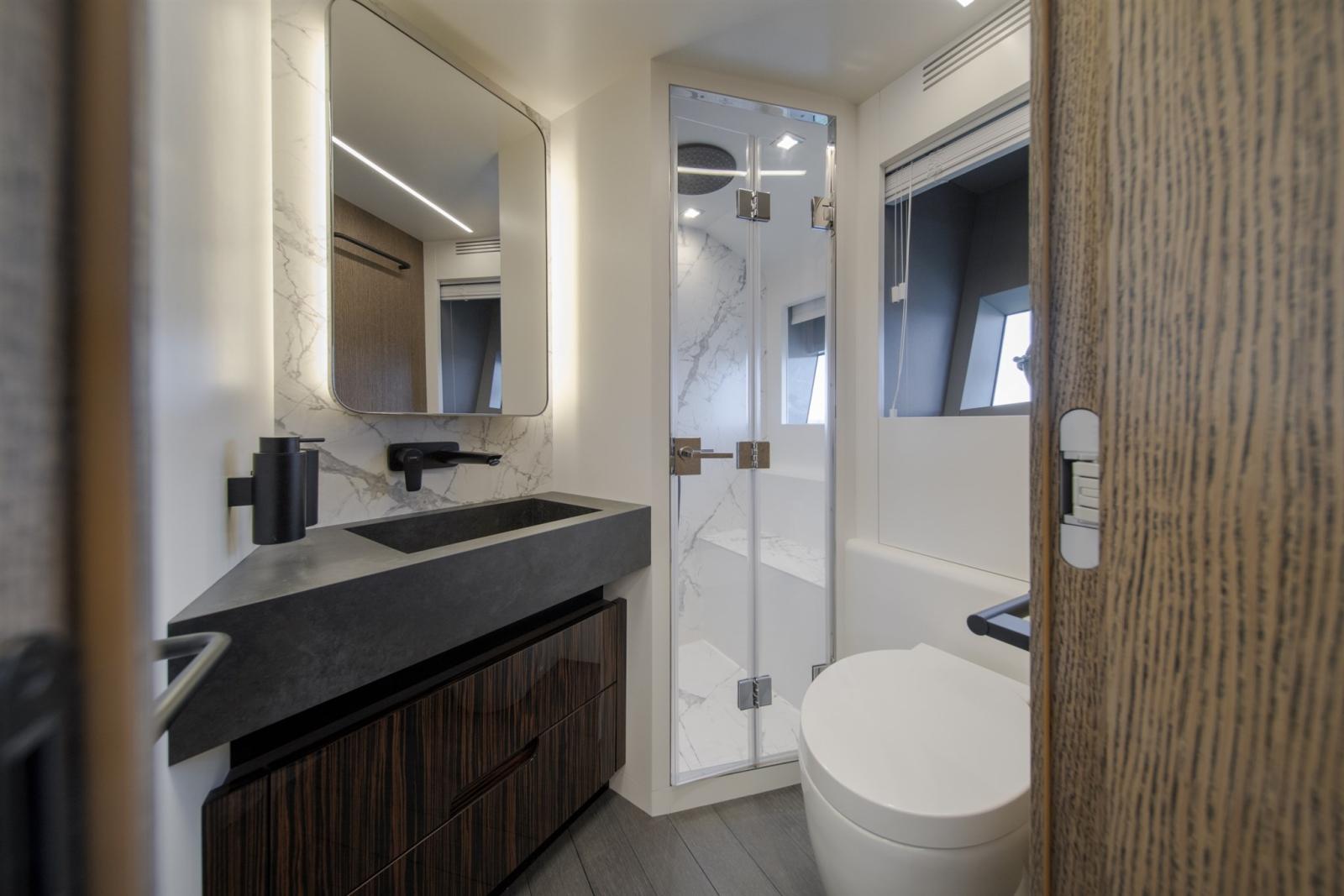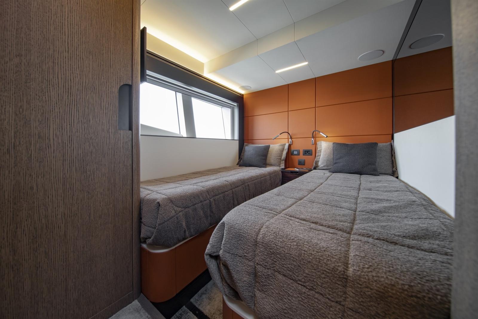 Quatre cabines, trois salles de bains sur le pont inférieur et la cabine de l’équipage - Salon, cuisine et poste de pilotage principal - Décoration Standard De Luxe - Plancher du salon en bois - Cabines avec moquette - Cuisine avec réfrigérateur, lave-vaisselle, four/micro-ondes et plaque à induction
