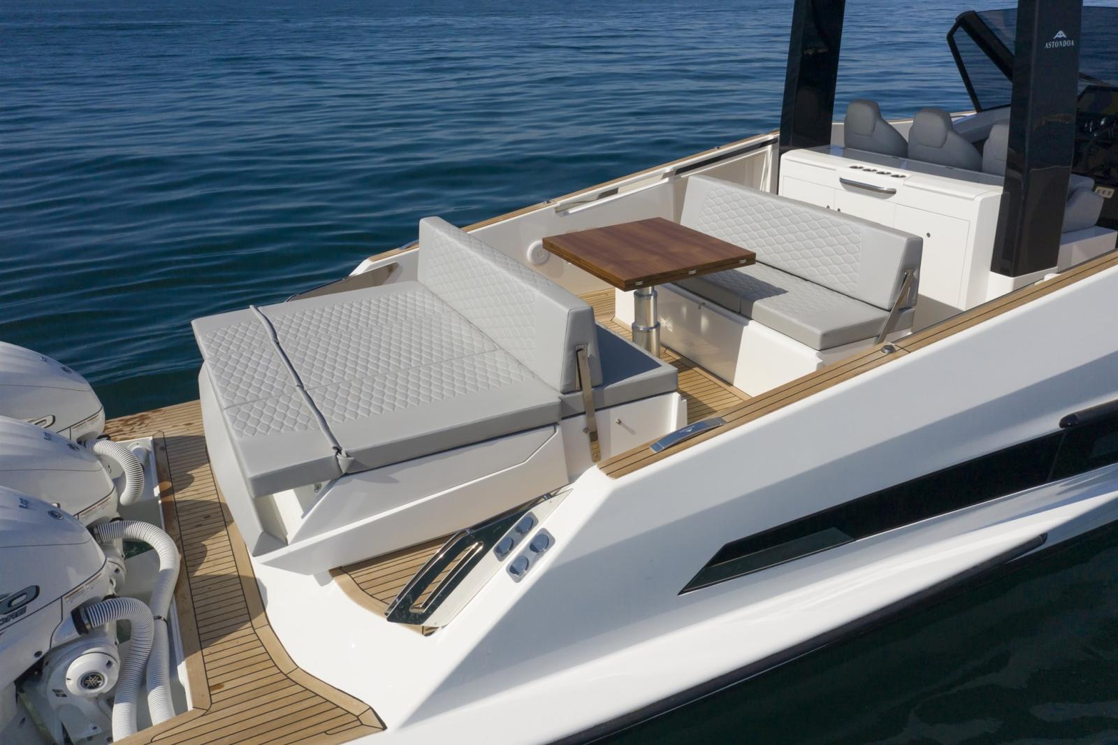Coque blanche Astondoa - Poste de pilotage blanc Astondoa - Toit rigide blanc Astondoa - Pare-brise en verre avec essuie-glace - Coffre de rangement avec bain de soleil avec ouverture électrique - Trois sièges de barre avec logo Astondoa brodé - Sellerie extérieure Silvertex - Dossiers de bain de soleil rabattables - Douche extérieure arrière - Armoire de cuisine extérieure avec évier, réfrigérateur 65 L et plaque à induction - Toit rigide avec éclairage LED - Lumières de courtoisie sur le pont principal